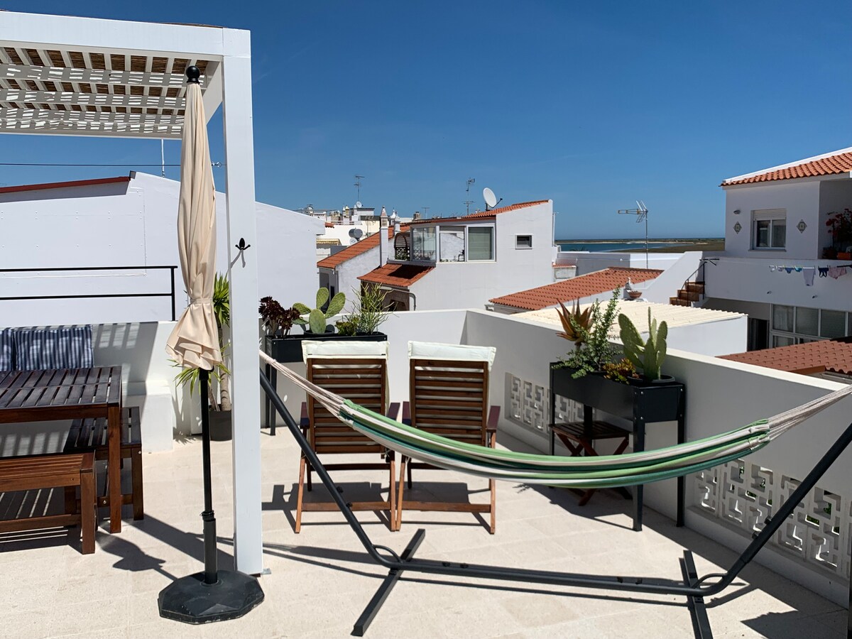 Γοητευτικό διαμέρισμα 1 υπνοδωματίου στη Santa Luzia, λίγα μόλις βήματα μακριά από τη Ria Formosa. Προς τα νότια, με δύο μπαλκόνια, το ένα με υπέροχη θέα στη θάλασσα μόλις λίγα μέτρα μακριά. Απολαύστε άφθονο φυσικό φως, κλιματισμό τόσο στο σαλόνι όσο και στο υπνοδωμάτιο και πλήρως εξοπλισμένη κουζίνα με smart τηλεόραση. Το αποκορύφωμα είναι η ταράτσα με εκπληκτική θέα 180 μοιρών στη θάλασσα και τη Ria Formosa. Ιδανικό για μια χαλαρωτική απόδραση ή ένα καταφύγιο για τηλεργασία δίπλα στο νερό.