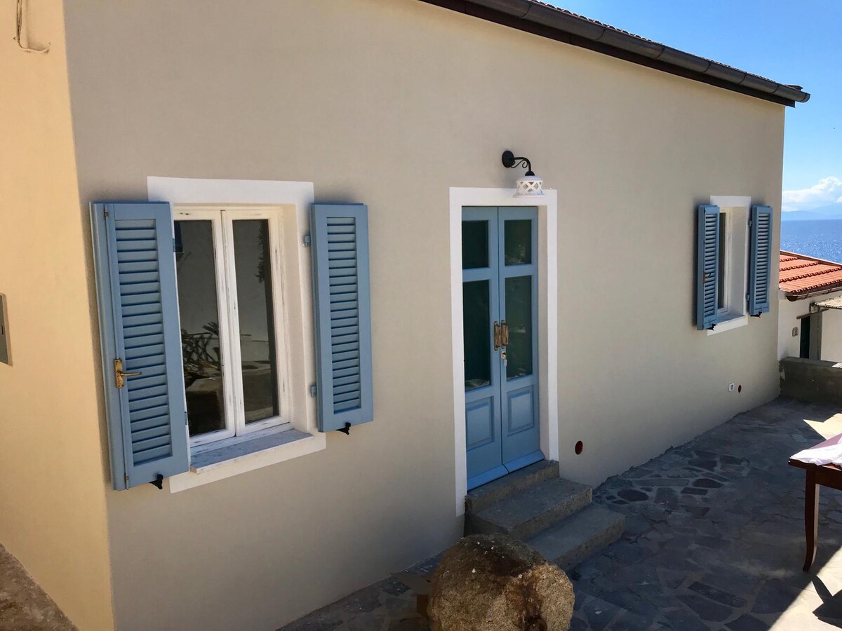 Delizioso appartamento arredato con cura, in stile etnico, provvisto di ogni comfort, in un casolare appena ristrutturato secondo i principi della bioedilizia, immerso nella macchia mediterranea del più bel versante dell'isola d'Elba, con vista mozzafiato sull'arcipelago toscano e sulla Corsica, a 250 m sul livello del mare, dominante la spiaggia di Cavoli. L'appartamento è composto di soggiorno con angolo cottura e divano-letto per due persone, camera matrimoniale e bagno con doccia e ampio spazio esterno attrezzato per pranzare e prendere il sole. Il luogo è raggiungibile con una strada sterrata di 2,5 km dal paesino di San Piero in Campo (fin dove arrivano i mezzi pubblici), distante pochi minuti di macchina dalle spiagge più incantevoli dell'isola (Cavoli, Seccheto, Fetovaia) e dal centro turistico e commerciale di Marina di Campo. E' consigliabile disporre di un mezzo proprio. La casa è immersa nella tipica macchia mediterranea alternata a grandi e suggestive scogliere di granito. Il grande giardino è recintato, contiene un orto e un uliveto. Non vi sono altre abitazioni nei dintorni. Intorno alla località si snodano i più suggestivi sentieri per gli amanti del trekking e della mountain bike. Ideale per chi è in cerca di silenzio, relax, aria pura, e ama la natura e i luoghi un pò speciali. I padroni di casa potranno aiutarvi per ogni evenienza e perplessità. BREATHTAKING VIEW ON THE ARCHIPELAGO Charming apartment,furnished in ethnic style,with every comfort,in an old cottage just renovated according to the bioarchitecture,amidst the Mediterranean bush in the most beautiful part of Elba island with breathtaking views on the Tuscan archipelago and (email hidden) a.s.l.,overlooking famous Cavoli beach. The apartment has a living room with kitchenette and divan bed for two persons,a double bedroom and a bathroom with shower and a large outside patio for eating and sunbathing. You can reach the place through a 2,5 Km dirt road from San Piero in Campo,where pubblic transport ends,and from where ,in few minutes by car you can get to the best beaches of the island (Cavoli,Seccheto,Fetovaia etc.),and to the touristic and service centre of Marina di Campo. It's better to have your own car or motorbike(you can rent it anywhere on the island). The house is surrounded by the typical mediterranean bush scattered with huge granite cliffs. The large garden has an olive grove and a vegetable garden. The place is secluded and there are no other houses in the surroundings. It's an ideal place for trekking and mountain biking and lovers of relax,peace,nature and special places. Your host are ready to help for any need and request.