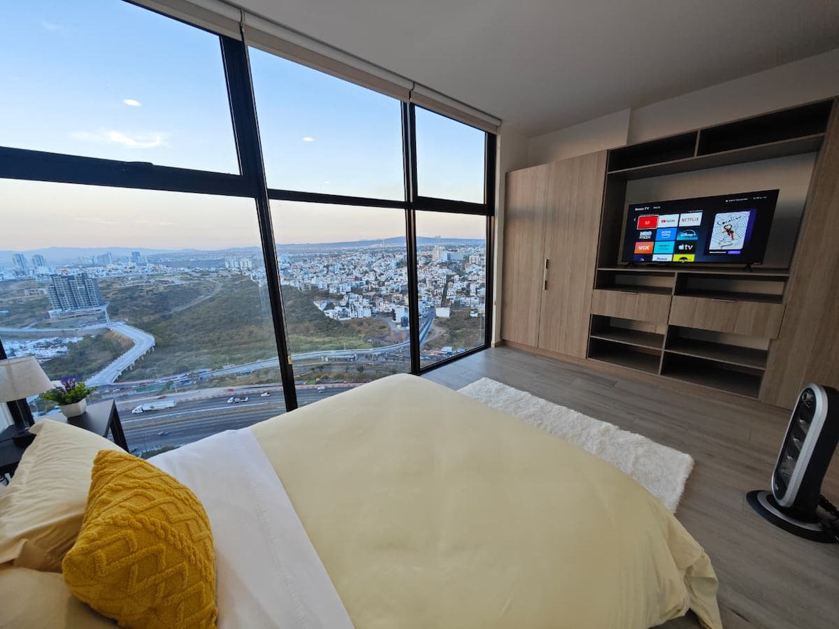 Bello y Seguro Departamento con vista hacia los Arcos de Querétaro. Perfecto para largas estancias, por su equipamiento 100% pensado en largas estancias así como sus más de 10 Amenidades de Lujo. Entre su equipamiento incluye: Escritorio para hacer HOME OFFICE Cocina 100% equipada Ingredientes de cocina Televisión en sala de 65" , Televisión en habitación de 55" Aire Acondicionado de 2 TONS frio/calor y muchas mas cosas que te harán amar este lugar por semanas. 1 cajón de estacionamiento