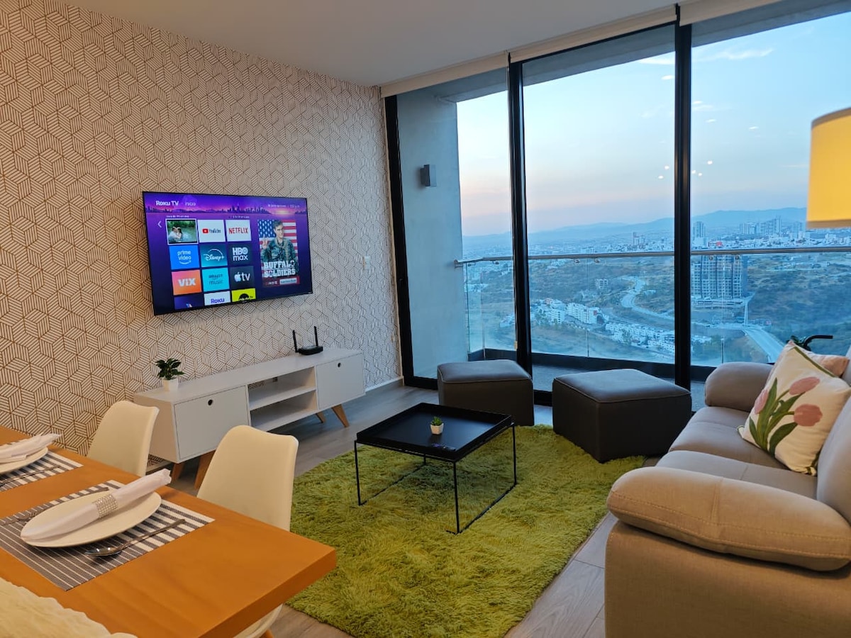 Brand-new, located in the heart of Juriquilla, this 160 m2 apartment offers a one-of-a kind experience, going above and beyond with amenities & entertainment. If you are looking for top quality, look no further and come to the most modern & luxurious apartment in Queretaro for an unforgettable stay Walking distance from Starbucks, Walmart, Bars and top restaurants like Sonora Grill & Hunger, this apartment has it all, comfortable beds, balcony, large 4K TVs and a 100" Home-Cinema from your bed