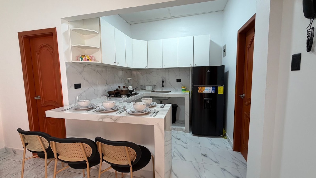 Αποδράστε σε έναν μοντέρνο και κομψό χώρο στον Άγιο Δομίνικο. Αυτό το πολυτελές διαμέρισμα βρίσκεται σε μια ασφαλή κατοικημένη περιοχή, λίγα λεπτά από το Paseo Shopping, το νέο Bombolí Shopping, τον σταθμό λεωφορείων, την Plaza La Quadra και τη διάσημη Calle del Colesterol, γνωστή για τη γαστρονομία της. Απολαύστε κλιματισμό σε κάθε δωμάτιο, home cinema, ευρύχωρα διπλά κρεβάτια, ένα δωρεάν μπουκάλι κρασί και ιδιωτικό πάρκινγκ με ηλεκτρική πύλη.