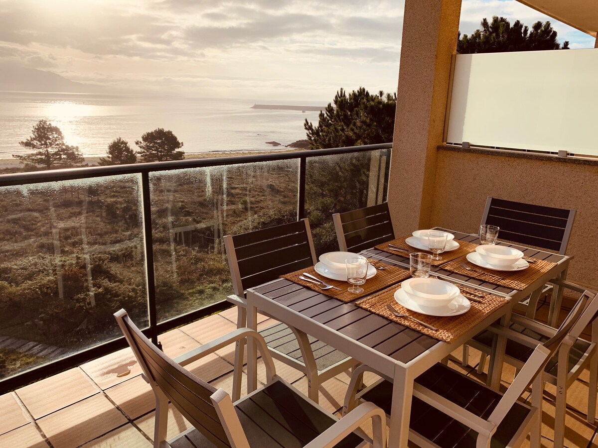 Μεγάλη βεράντα, όλος ορίζοντας μπροστά από την παραλία της Langosteira, στο Finisterre. Ένα από τα πιο όμορφα και εμβληματικά μέρη της Γαλικίας, το τέλος της διαδρομής. Γαλάζια νερά και ωραία παραλία με λευκή άμμο. Η γαστρονομία και ο πολιτισμός συνδυάζονται σε ένα μοναδικό μέρος.