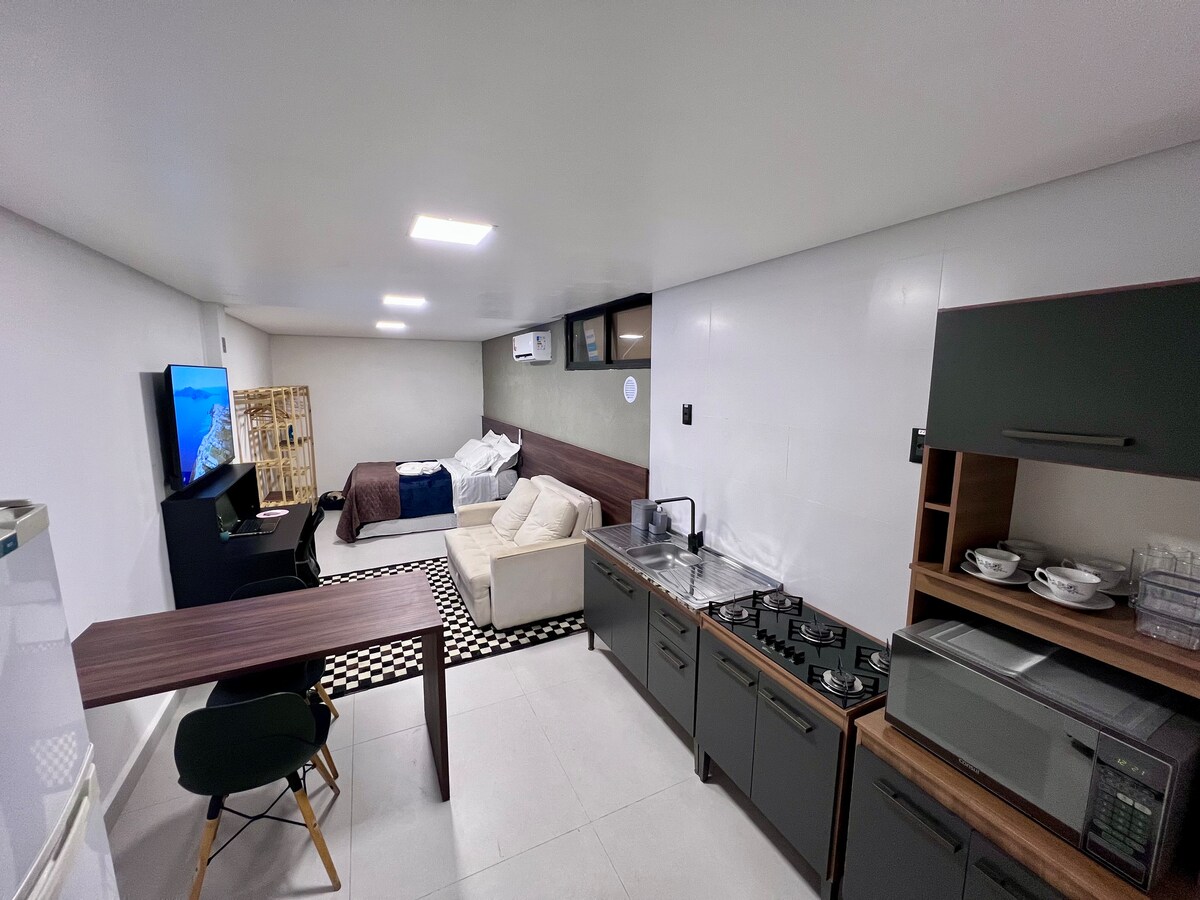 Μοντέρνο και άνετο στούντιο στη γειτονιά Abraão, στο Florianópolis, σχεδιασμένο για να προσφέρει άνεση και πρακτικότητα. Φιλοξενεί έως 4 άτομα, με ένα διπλό κρεβάτι, καναπέ-κρεβάτι, λειτουργική κουζίνα, ιδιωτικό μπάνιο και γρήγορο Wi-Fi, ιδανικό και για γραφείο στο σπίτι. Καθαρό και άνετο περιβάλλον, ιδανικό για ζευγάρια, φίλους ή μικρές οικογένειες. 📍 400 μέτρα από την Praia do Bom Abrigo, κοντά σε άλλες παραλίες, 10 λεπτά από το κέντρο της πόλης, κοντά σε αγορές και υπηρεσίες. Εδώ νιώθετε σαν στο σπίτι σας. 🤍