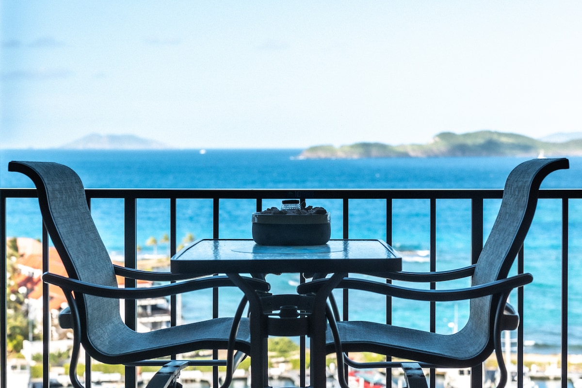 Located at Sapphire Beach Resort! Prime ocean and marina views! This beautifully decorated and fully furnished condo sleeps up to 4. Enjoy the beautiful views of the marina and St. John all from the private balcony. The condo offers outdoor grill, full cable package, AC, WIFI, and plush King bed and Queen sofa pullout. If needing additional space for friends or family we do have another property at Sapphire Beach Resort and are happy to accommodate your group.
