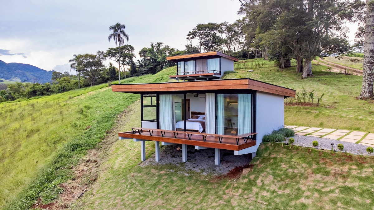Ανακαλύψτε τη μαγεία της οροσειράς Mantiqueira σε αυτό το ξυλόσπιτο που έχει σχεδιαστεί έτσι ώστε να μπορείτε να θαυμάσετε την ανατολή του ηλίου χωρίς να σηκωθείτε από το κρεβάτι. Ελάτε να χαλαρώσετε στο θερμαινόμενο σπα μας, να παρατηρήσετε τα αστέρια στην αιώρα και την κούνια. Το ξυλόσπιτο διαθέτει ένα ενσωματωμένο υπνοδωμάτιο με ένα άνετο κρεβάτι Queen. Στο σαλόνι/κουζίνα, ένα εξαιρετικά άνετο φουτόν μπορεί να φιλοξενήσει δύο επιπλέον επισκέπτες, καθιστώντας την εμπειρία ιδανική για οικογένειες. Το ακίνητο διαθέτει επίσης μονοπάτια και μικρούς καταρράκτες. Αυτός ο χώρος είναι ένα μοναδικό καταφύγιο.