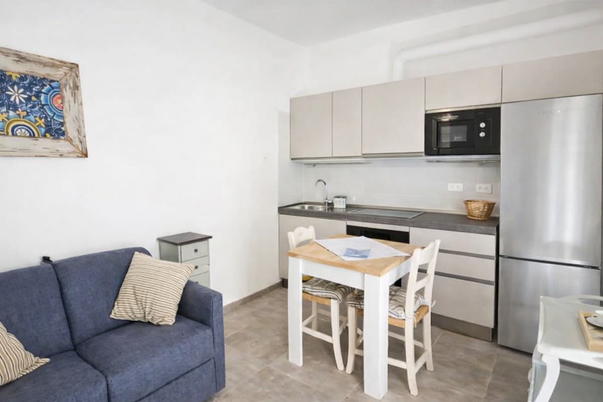 Αυτό το φιλόξενο στούντιο είναι ένα μικρό κόσμημα με καλά αξιοποιημένο χώρο. Η είσοδος βρίσκεται σε μια εσωτερική αυλή στο ισόγειο. Το διαμέρισμα είναι λειτουργικά επιπλωμένο, με ανοιχτή κουζίνα, μικρό τραπέζι φαγητού, καναπέ, κρεβάτι και ένα μικρό μπάνιο με ντους. Παρά το μικρό μέγεθος, η έξυπνη χρήση του χώρου και η κεντρική του θέση το καθιστούν ιδανικό για όσους εργάζονται ή ακόμα και για τουρίστες που αναζητούν την απλότητα σε απόσταση αναπνοής από τη θάλασσα.
