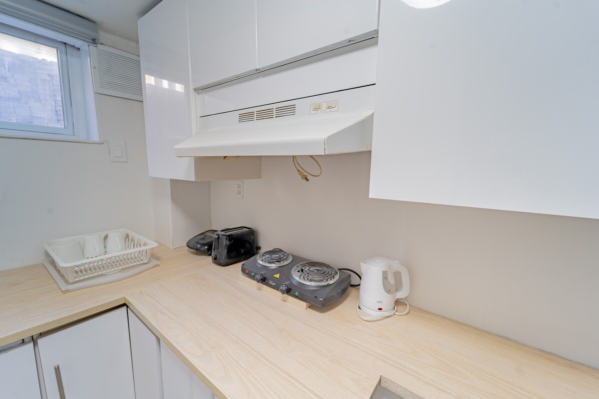 Απολαύστε ένα νεόκτιστο, επαγγελματικά σχεδιασμένο, ευρύχωρο διαμέρισμα 1 υπνοδωματίου στο υπόγειο στο East York του Τορόντο. Το διαμέρισμα βρίσκεται σε βολική τοποθεσία κοντά στο Danforth, την παραλία Woodbine, πάρκα και μονοπάτια, σε μικρή απόσταση με λεωφορείο/μετρό ή 15 λεπτά με το αυτοκίνητο από το κέντρο του Τορόντο. Αυτάρκες και ευρύχωρο, προσφέρει πλήρως εξοπλισμένη κουζίνα, νέες εγκαταστάσεις πλυντηρίου, κρεβάτι queen size, άφθονο αποθηκευτικό χώρο και άφθονο φυσικό φως.