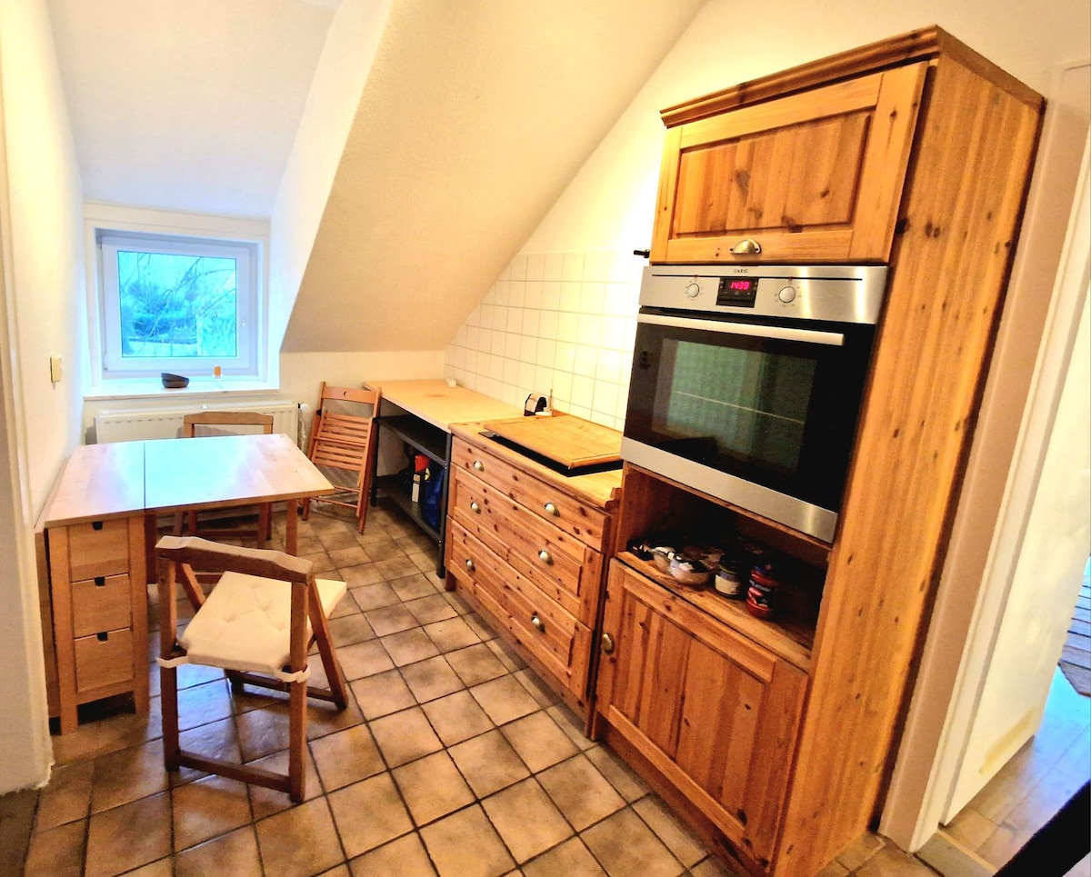 Ca. 60 m² große Wohnung im 1. Stock (mit Dachschrägen ist zu rechnen) zum Entspannen mitten in Alt Duvenstedt im Naturpark Hüttener Berge in der Nähe von der A7. Das gesamte Gebäude, in dem sich die Wohnung befindet, besteht aus zwei Häusern mit drei Wohneinheiten verbunden durch eine ehemalige Schmiede. Die Ferienwohnung ist im älteren Teil des Gebäudes und hat eine eigene Wohnungseingangstür. Nach vielen Ausflügen zu Fuß, per Rad oder Auto (oder wie auch immer) ist sie der ideale Rückzugsort.