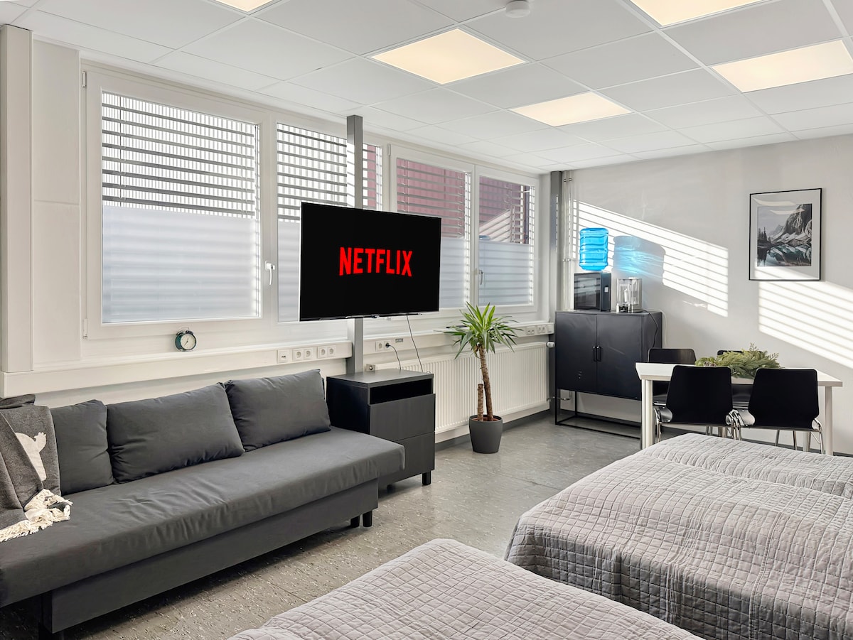 Το διαμέρισμα βρίσκεται σε μια ήσυχη κατοικημένη περιοχή και είναι ολοκαίνουργιο. Υπάρχουν αρκετές θέσεις στάθμευσης ακριβώς μπροστά από το σπίτι. Το ντους είναι προσβάσιμο και η είσοδος μπορεί να γίνει χωρίς προβλήματα χωρίς εμπόδια. Το διαμέρισμα βρίσκεται στο ισόγειο. Τα καταστήματα βρίσκονται σε απόσταση 7 λεπτών με τα πόδια, καθώς και διάφορα εστιατόρια και το καλοκαίρι ένα παγωτατζίδικο.
