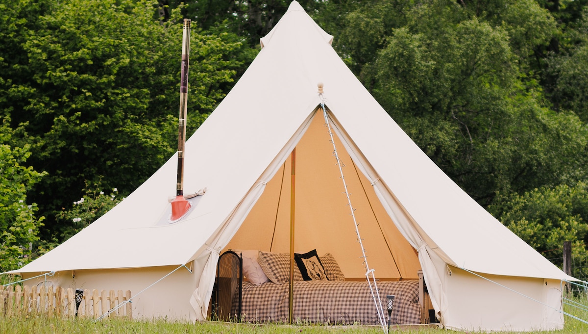 Σκηνήνη Bell, πλήρης με διπλό κρεβάτι και δύο μονά πτυσσόμενα κρεβάτια. Όλα τα κλινοσκεπάσματα και οι κουβέρτες παρέχονται για να σας κρατήσουν άνετα. παρέχεται μπάρμπεκιου και βραστήρας αερίου Παρέχεται ηλεκτρικό ντους με αέριο και τουαλέτα κομποστοποίησης για προσωπική χρήση. Εξωτερική βρύση για φρέσκο νερό επίσης. Ιδανικό για μια ή δύο διασκεδαστικές νύχτες για κατασκήνωση για παιδιά. Χώρος στάθμευσης στις εγκαταστάσεις * Να έχετε υπόψη σας ότι, αν και βρίσκεται στο δάσος δίπλα στον κήπο μας, είναι επίσης κοντά σε έναν δρόμο, οπότε μπορεί να υπάρχει κάποιος θόρυβος από την κίνηση. παρέχουμε ωτοασπίδες 😊