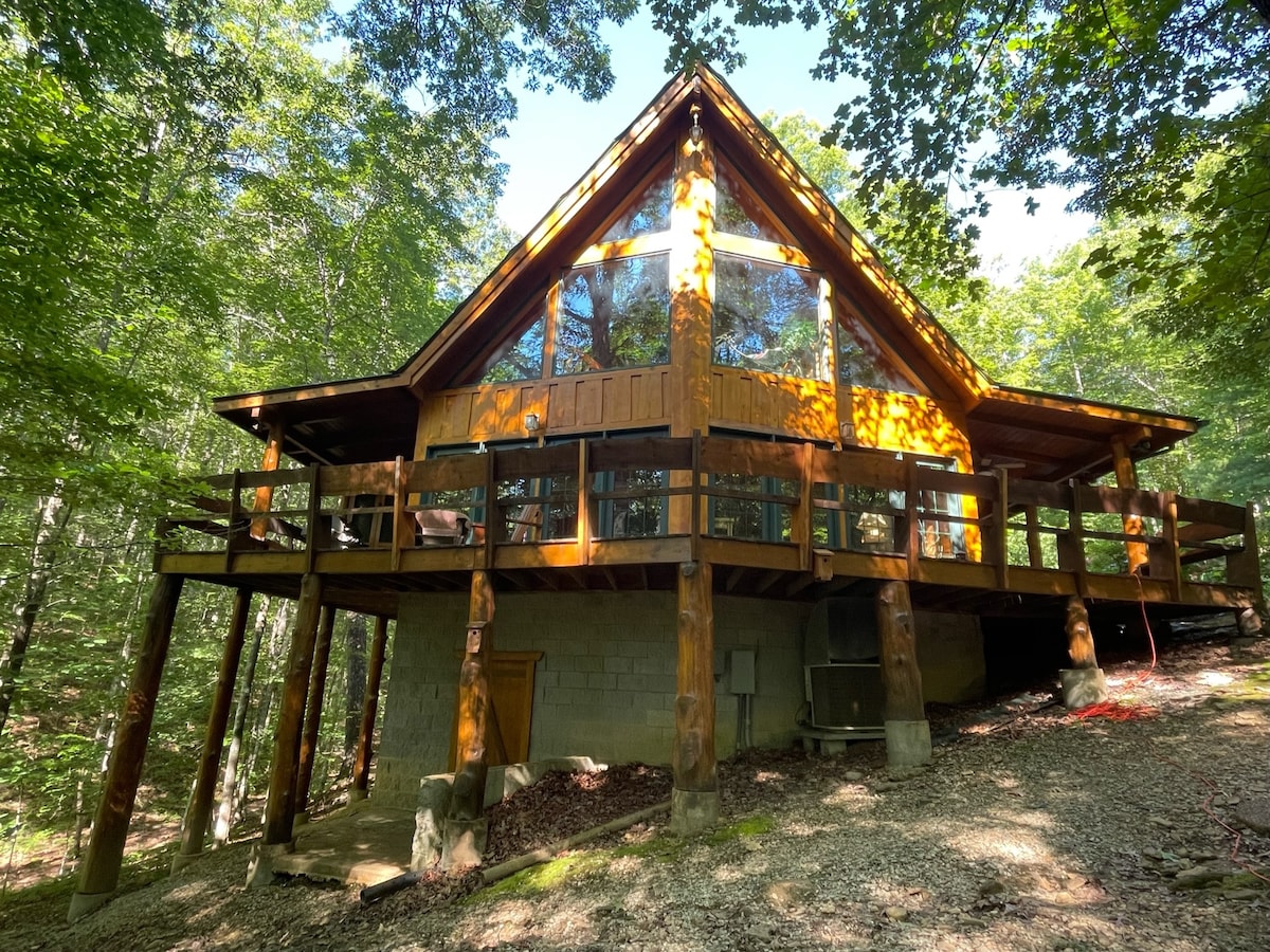 A cozy log cabin for two nestled in the trees like your very own adult treehouse with an amazing HOT TUB! Granite & stainless kitchen, FIREPLACE, W/D, KING bed. 55" TV/STREAMING & WiFi w/desk. The two person HOT TUB (with two pumps and 42 jets) snuggles up to a gorgeous hemlock tree. Many squirrels to amuse you! The private porch also has a gas grill, cedar double rocker, & dining. Cabin is between Jamestown & Oneida, in Big South Fork, with numerous trailheads & hiking nearby.