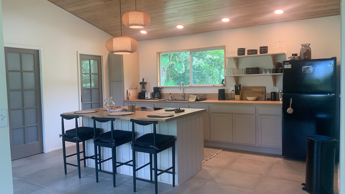 Peaceful and private modern retreat in prime location between Kehena Black Sand Beach (.4 mile walk) and nearby thermal ponds at Pohoiki just a few miles down the picturesque and coastal "Red Road." Enjoy a comfortable and clean space surrounded by a lush tropical landscape. Hear the sound of crashing waves from within the stylish interior or spacious lanai. This creative, vibrant area hosts a large drum circle on Sunday nights as well as local music and food down the road at Uncle Roberts.
