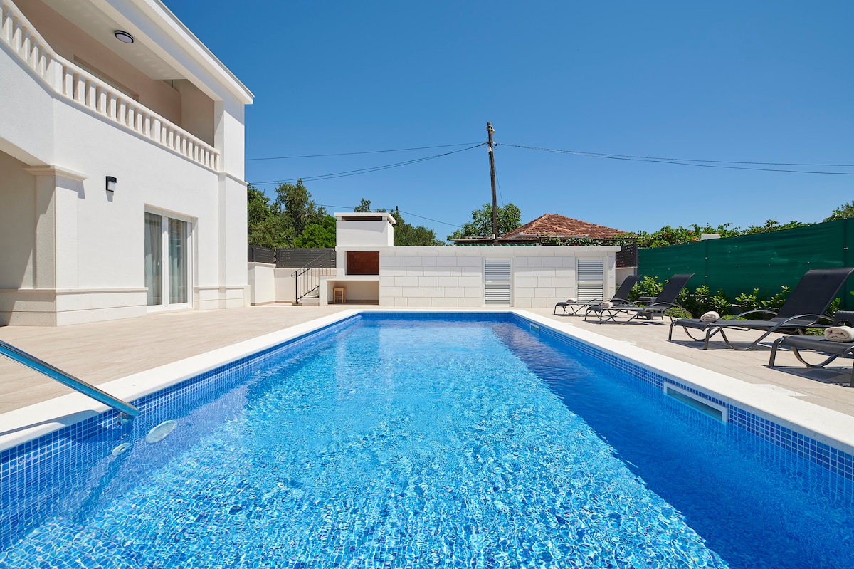 Novouređena Villa Barbara & Zoran ima 4 smjestajne jedinice. 2 na drugom katu i 2 na trećem katu. Svaki apartman je moderno uređen i ima veliku terasu i pogled na more.Imamo i veliki parking u ograđenom dvorištu. Prostrani grijani bazen od 50 m2 je na raspolaganu našim gostima. Barbara i Zoran su vlasnici i rado ćemo vam dati dodatne info da bi vas godišnji bio što ugodniji.Aerodrom Split je 15 km,a aerodrom Zadar 120 km udaljen od Ville. Split je 30 km,a Trogir 5 km od Ville.