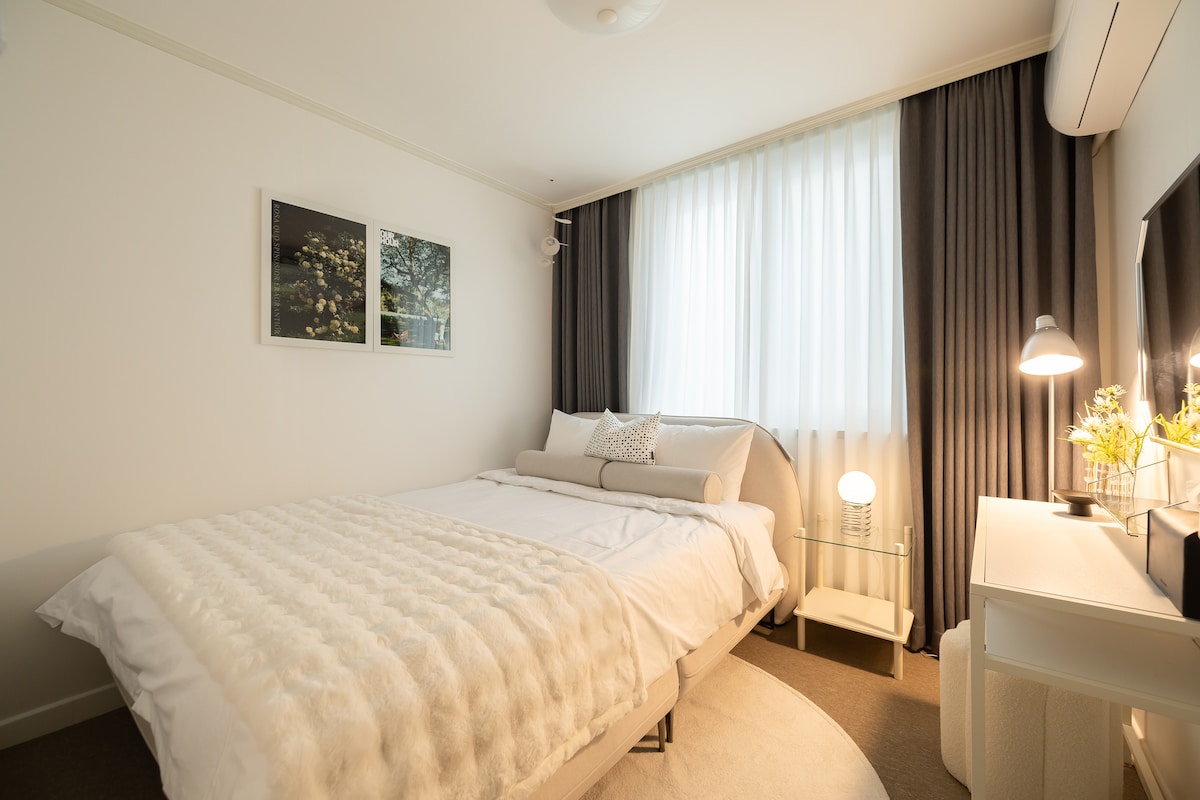 Welcome to our design house, created by a former architecture student from Samsung Engineering & Construction and a Qartar Airways flight attendant! This model-like house is furnished with stylish, new furniture, perfect for a fresh start. Marshall, Bose speakers and considering hosting a wine party for up to six people—it's an ideal setting for a newlywed couple! Super-sized projector where you can watch the latest films. Fantastic photo spot, filled with beautiful decor and charming props.