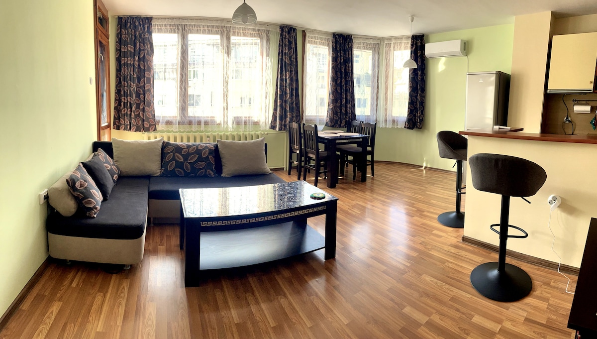 Our apartment is situated on the 5th floor, the building is right next to Geo Milev city park. Set conveniently between the airport and the city centre this is a very quiet location and also close to bus links, suitable for singles, couples and business travellers a like. The comfortable design and decor will make you feel at home and help you relax after the busy day. In the apartment you will find everything you will need to make your stay perfect!