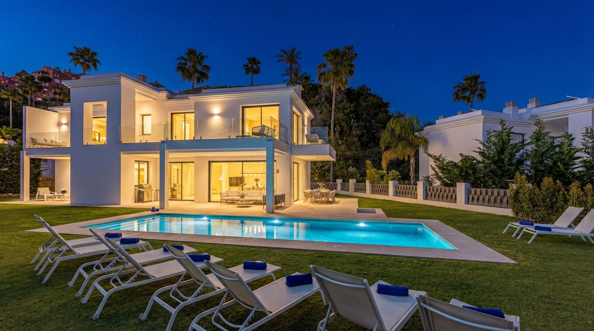 Η Villa Monte Elviria βρίσκεται 8 λεπτά από τις καλύτερες παραλίες της Marbella, σε έναν λόφο με μαγευτική θέα στη θάλασσα, το Γιβραλτάρ και τα βουνά Sierra de las Nieves, που αποτελούν παγκόσμια κληρονομιά της UNESCO. Η βίλα διαθέτει: -Μια μεγάλη πισίνα υπερχείλισης που ΘΕΡΜΑΊΝΕΤΑΙ ΌΛΟ ΤΟ ΈΤΟΣ -Έναν κήπο που περιλαμβάνει κρεμαστούς κήπους, ισπανικό αίθριο, βεράντες και γκαζόν -5 μεγάλα υπνοδωμάτια, συμπεριλαμβανομένων 4 ιδιωτικών μπάνιων με κρεβάτια king size κορυφαίας ποιότητας (διατίθενται επίσης σε διπλό σετ) -Πλήρως εξοπλισμένο σινεμά και μπιλιάρδο -Κλιματισμός σε όλο το κατάλυμα