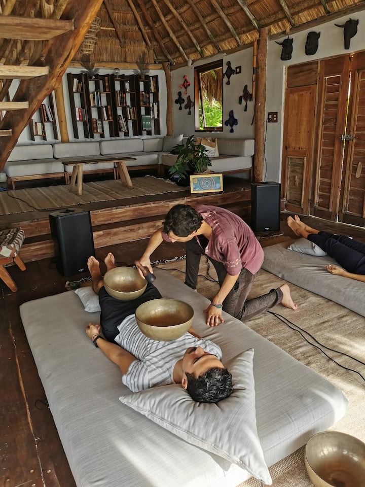 Συνεδρία διαλογισμού με ήχο, με 12 μεταλλικά μπολ Θιβέτ, κύμβαλα και διαπασών που είναι ρυθμισμένο στα 432Hz. Ξαπλώνετε ενώ ο ήχος δονείται γύρω σας και πάνω στο σώμα σας, προκαλώντας μια βαθιά κατάσταση ηρεμίας, ενδοσκόπησης και ενεργειακής ισορροπίας. Ιδανικό για όσους αναζητούν μια χαλαρωτική, αναζωογονητική και μεταμορφωτική διαλογιστική εμπειρία. Δεν χρειάζεται να έχετε προηγούμενη εμπειρία, απλώς να είστε ανοιχτοί στο να νιώσετε και να ακούσετε με όλο σας το είναι.