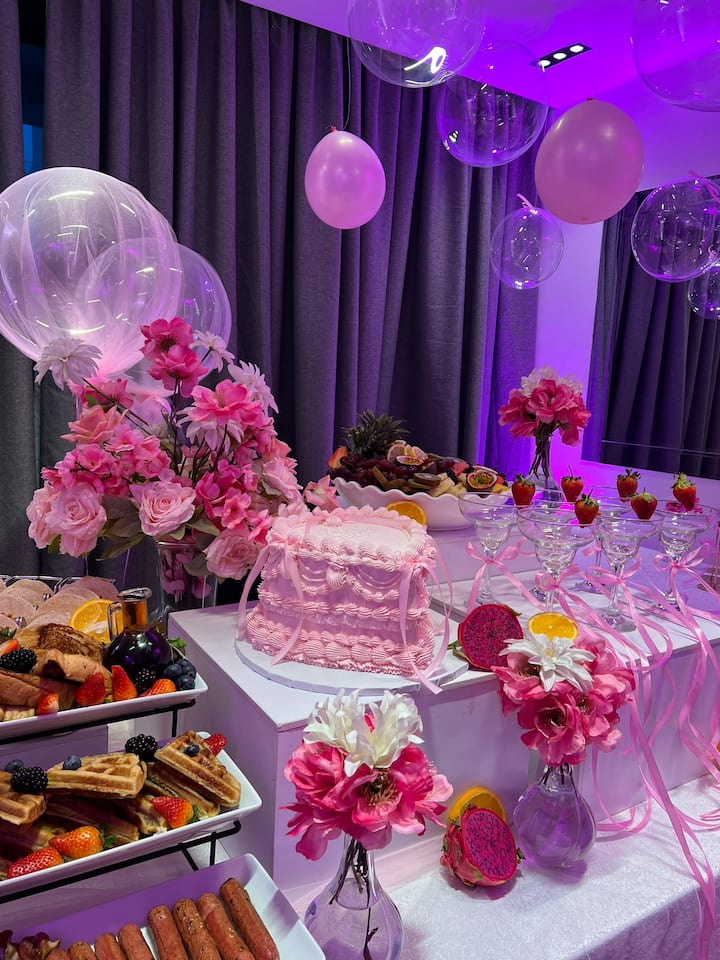 Προθήκη για brunch με πολλές επιλογές, όπως κλασικό αμερικανικό brunch με βάφλες και τηγανίτες/πάνκεϊκ με μούρα, γαλλικό τοστ, μπέικον ή/και λουκάνικο, πατάτες για πρωινό, πιατέλα με εξωτικά φρούτα, κέικ της επιλογής σας και μοκτέιλ πορτοκαλιού! Περιλαμβάνεται σύνθεση με φρέσκα λουλούδια και μπαλόνια, καθώς και η διαρρύθμιση του χώρου!