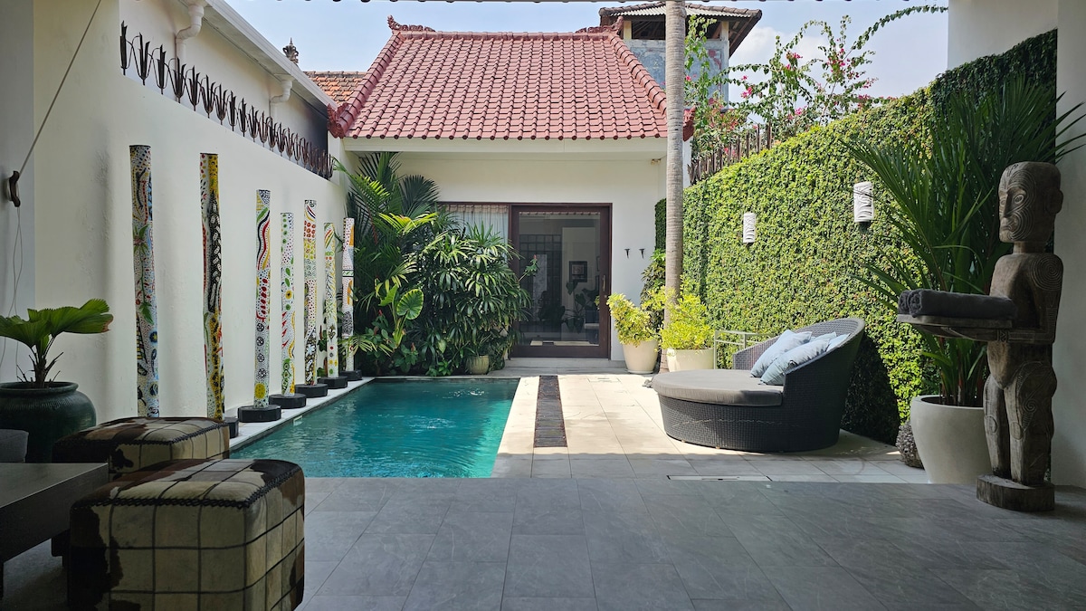 Modern Designer Villa in Canggu • 2 chic air-conditioned bedrooms with ensuite bathrooms • Bathrooms with walk-in showers, organic amenities & hairdryers • Private pool surrounded by a lush tropical garden • Elegant sunken living room with glass walls & custom interiors • Fully equipped modern kitchen & dining space • Wi-Fi 300 Mbps • Smart TV with Netflix, PS5 on request • Daily cleaning, fresh linens & towels • Baby cot & high chair on request • Concierge service for transport, tours & more