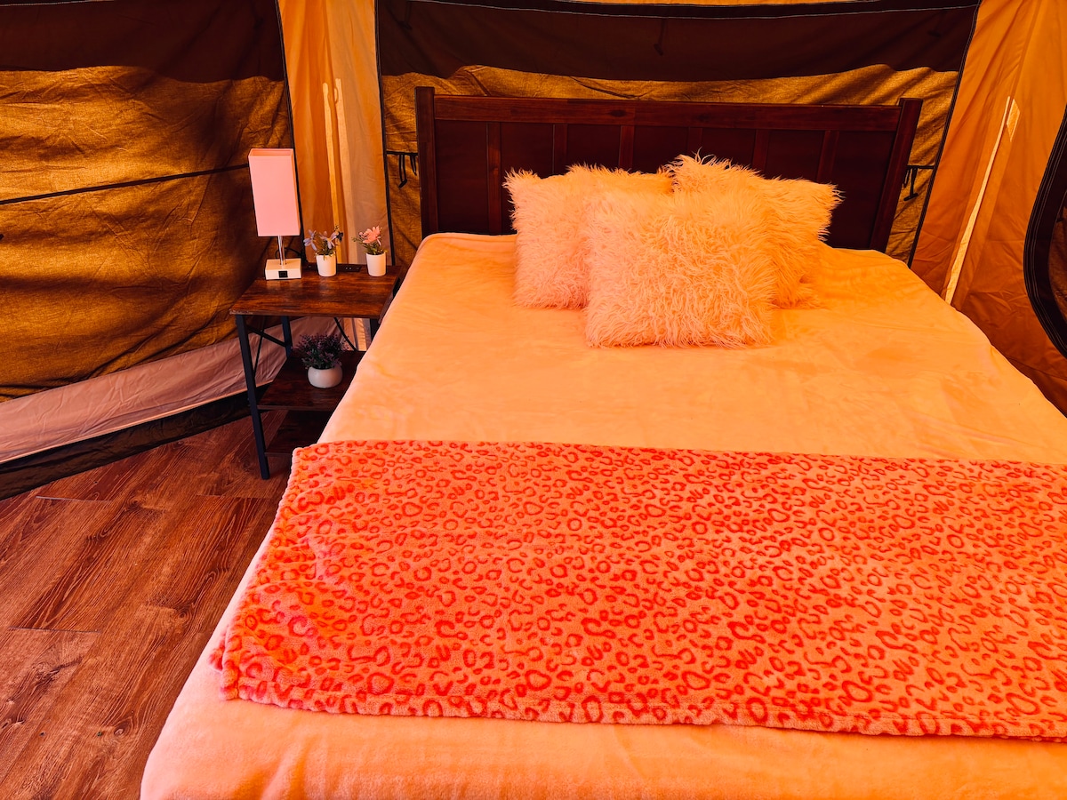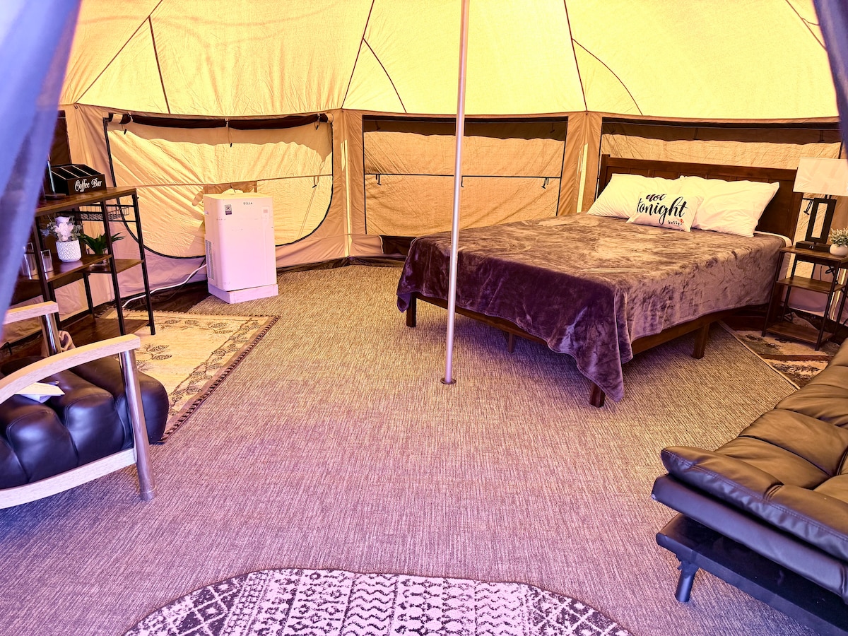 ** NEW TENTS COMING IN 2026!!** Relaxation awaits you in your very own Lotus Belle tent. Surrounded on one side by National Park land. Make lifelong memories around the campfire.Roast marshmallows, grill up your favorite meal and enjoy a fun night of board games and so much more! You have your own private pergola and will have a great night sleep in our memory foam beds. Don't forget about a nice hot shower in our well-appointed bathhouse. This tent has ac but no heat.