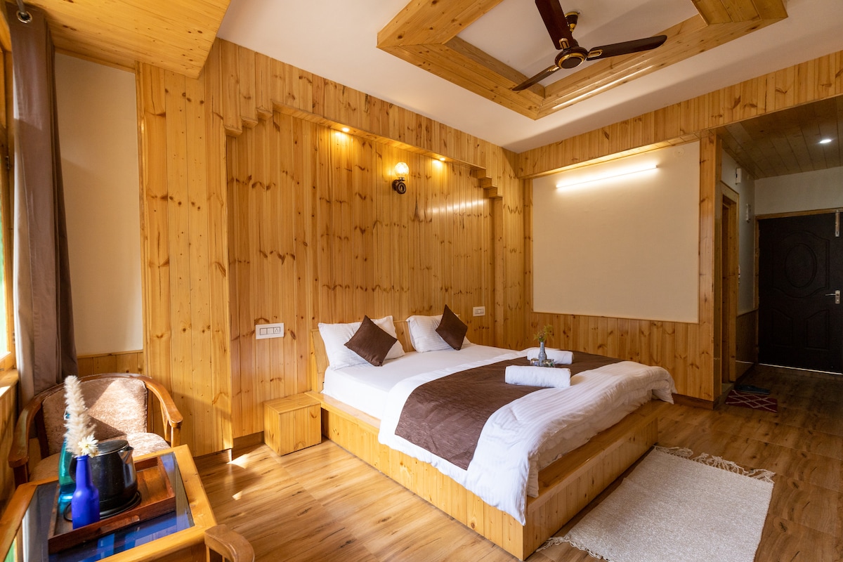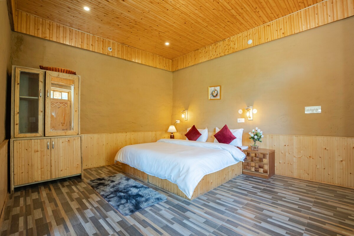 🏡 Αγκαλιάστε την ηρεμία του βουνού στο Rubaroo - ένα μέρος όπου θα λατρέψετε να βρίσκεστε ❤️ Χαλαρώστε στο ευρύχωρο ξύλινο εξοχικό μας που διαθέτει ένα πολυτελές υπέρδιπλο κρεβάτι και ένα μοναδικό μπαλκόνι σε σχήμα L με διπλά σημεία εισόδου. Το δωμάτιό σας βρίσκεται στον πρώτο όροφο της ορεινής βίλας μας και προσφέρει θέα στην ανατολή του ηλίου μαζί με μακρινές κορυφές. Ζήστε το τέλειο μείγμα ρουστίκ γοητείας και άνεσης. Απολαύστε σπιτικά μαγειρεμένα γεύματα✨, βραδιές με αστέρια και γνήσια ορεινή φιλοξενία στο γαλήνιο χωριό μας κοντά στο Jibhi 🌄