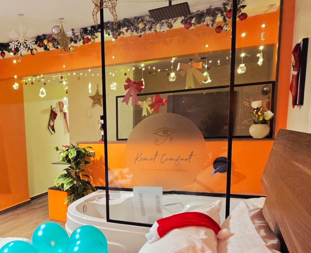 “Seasonally decorated for Christmas to create a warm, festive, and romantic atmosphere.” Your Perfect Blend of Work and Luxury Relaxation! Just 5 minutes from the airport, our stylish studio offers unmatched convenience for travelers and professionals. Whether for business or leisure, enjoy a seamless stay where productivity meets comfort. Relax in jacuzzi after a busy day or use dedicated workspace to stay focused. Experience modern amenities, impeccable cleanliness, and warm hospitality.