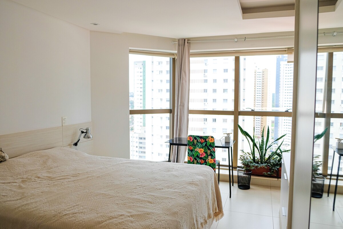 Σύγχρονο στούντιο στο Jardim dos Estados, με πανοραμική θέα και πλήρη δομή. Φιλοξενεί έως 4 άτομα (διπλό κρεβάτι + καναπές-κρεβάτι), διαθέτει κλιματισμό, Wi-Fi 300 mbps, εξοπλισμένη κουζίνα, δύο Smart TV και ιδιωτικό στεγασμένο γκαράζ. Στο κτίριο: θερμαινόμενη πισίνα, πισίνα υπερχείλισης, στεγνή σάουνα, γυμναστήριο, χώρος συνεργασίας, αίθουσα παιχνιδιών και πλυντήριο (επί πληρωμή). 24ωρη υπηρεσία θυρωρείου, ασανσέρ με πανοραμική θέα και πολλές ανέσεις σε μία από τις καλύτερες τοποθεσίες της πόλης.