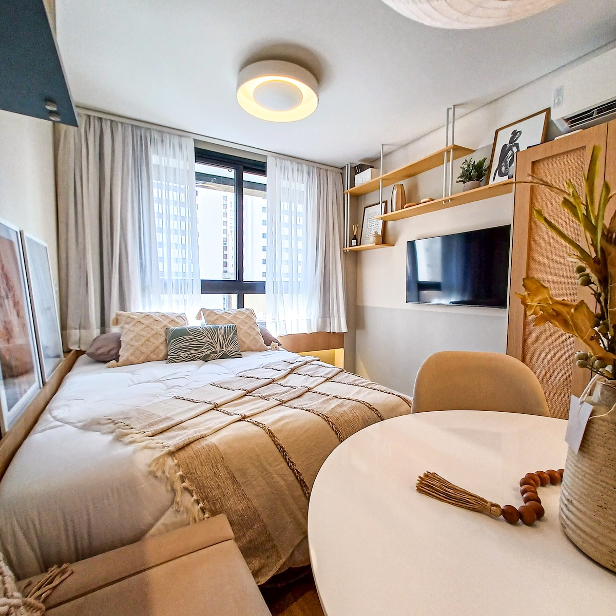Modern studio condo in Rebouças, 5 min from Mercado Municipal, Shopping Estação, and near cafés and bars. Easy access: 10 min to the bus station, 25 min to the airport. AC + heating; gas water shower; co-working; 400 Mb Wi‑Fi + desk; queen bed with hotel‑style linens + blackout shades; equipped kitchen; smart TV streaming; 24 h self check‑in; laundry & gym in the building.