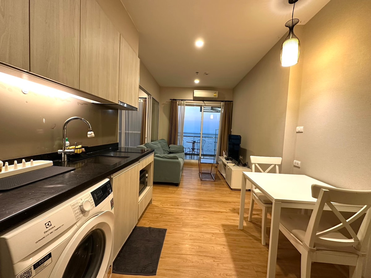 Welcome to your serene escape at Yuu Residence, a luxurious beachfront condo designed with a unique Zen aesthetic. This peaceful apartment features a traditional low table and cushions, creating a tranquil atmosphere. The space includes a comfortable bed, a modern bathroom with a bathtub, and a well-equipped kitchen with a washer. Enjoy stunning sea views from your window and relax in style. The building offers top-tier amenities including an onsen and infinity pool.