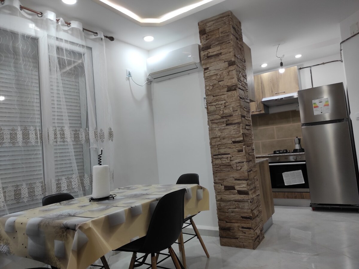 Καλώς ήρθατε στο Jijel! Το διαμέρισμά μας είναι καινούριο και κλιματιζόμενο, ιδανικό για διακοπές ή επαγγελματικά ταξίδια. Πλήρως εξοπλισμένο και προσφέρει κρύο και ζεστό νερό 24 ώρες το 24ωρο. Βρίσκεται 800 μέτρα από την παραλία Corniche, 400 μέτρα από την παραλία Zwai και 800 μέτρα από την παραλία Al Naseem. Κοντά σε εστιατόρια, σούπερ μάρκετ, φαρμακείο και σταθμούς λεωφορείων. Περιλαμβάνει ασφαλή στάθμευση. Απολαύστε έναν ήσυχο δρόμο και ξεκούραστες νύχτες!
