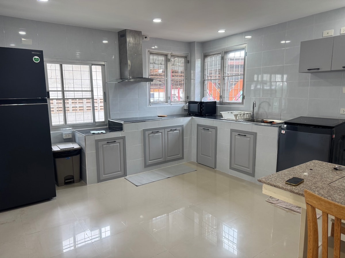 🏡 Fully equipped & furnished/ 3 bedrooms /3 baths ( with water heaters )/ 2-3 cars parking on premises / max. 6 guests 🚫🚬 🛌Room1: 1 king bed + attached bathroom 🛌Room2: 1 queen bed 🛌Room3: 1 king bed ✅TV ✅internet ✅kitchen supplies ✅ Electric stove ✅Microwave ✅fridge ✅washing machine ❌ no dryer 🚙 500 m. to 7-11, Lotus, shops 🚙 3 km. to KKU, Sri Nakarind 🏥, Lotus Extra, Makro 📌 KKU : famous restaurants & cafes / shops / museums 🐶pet: please inbox for permission