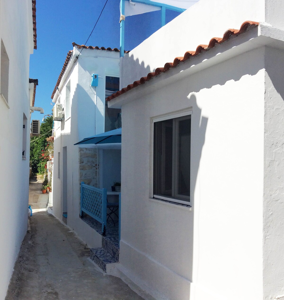 Welcome to Kosmima, a beautiful gem set in the heart of Skiathos town. Carefully restored, this unique home is situated 150m from both ports, close to shops, bars and restaurants. With its private courtyard you can relax in comfort. Kosmima sleeps 4 with 2 double bedrooms and 2 bathrooms. Fully fitted kitchen and breakfast bar. This is an old house and the ground floor has low ceilings so taller people may be more suited to the upper bedroom. The house has A/C, WiFi and USB charging points.