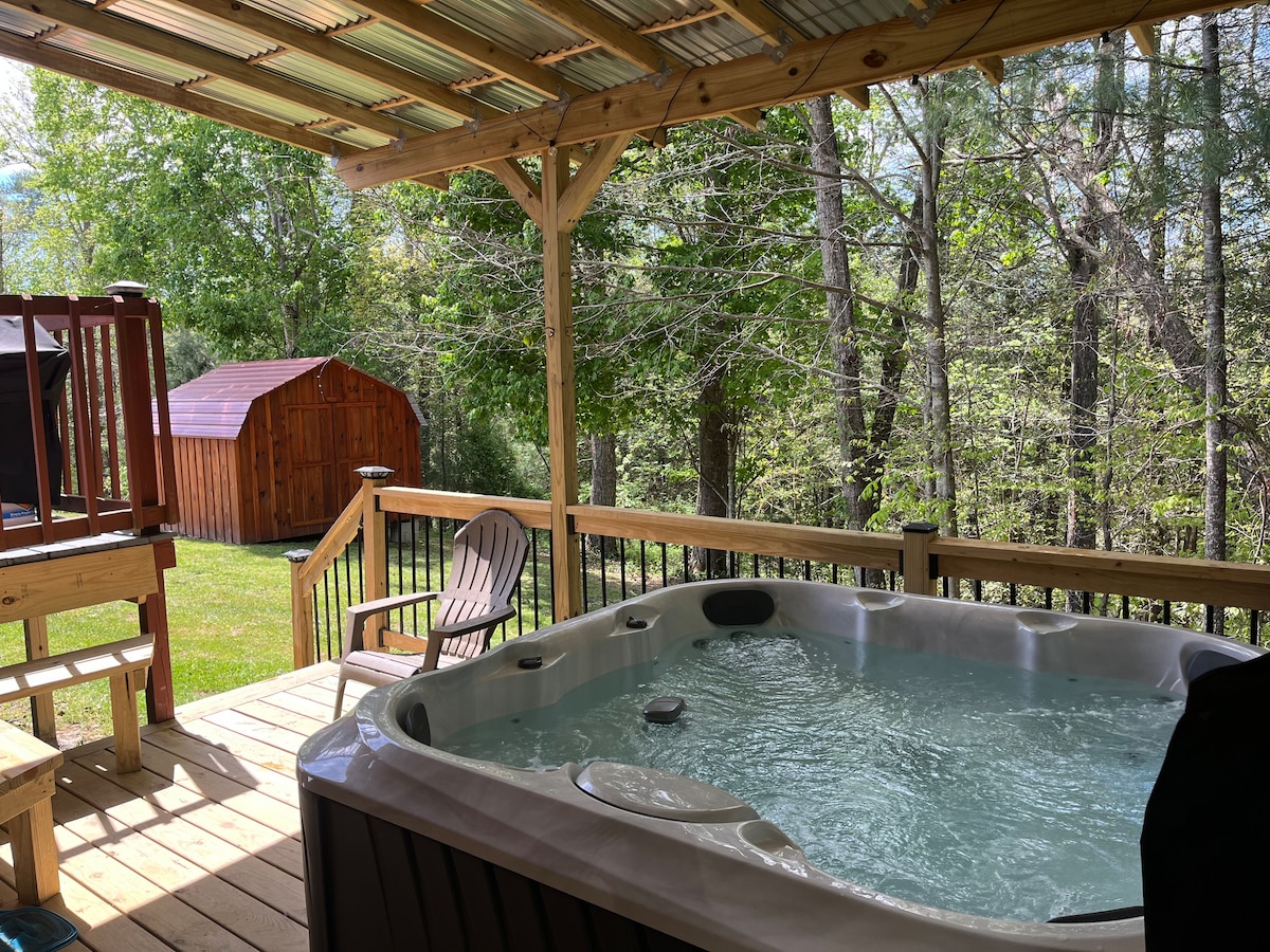 Mountain Farmhouse. A place where you can relax, drink your coffee, listen to the sound of the birds in the morning the whippoorwills & crickets at night. On the back porch there is a hot tub to enjoy, an outdoor bar & dining area with a projector/home theater setup in front of the hot tub! A gas grill. WiFi & NFLX/Hulu/Disney. A beautiful old home recently remodeled with a wrap around driveway. 1 bedroom down. 2 bedrooms upstairs. Secluded location & plenty of space for entertaining.