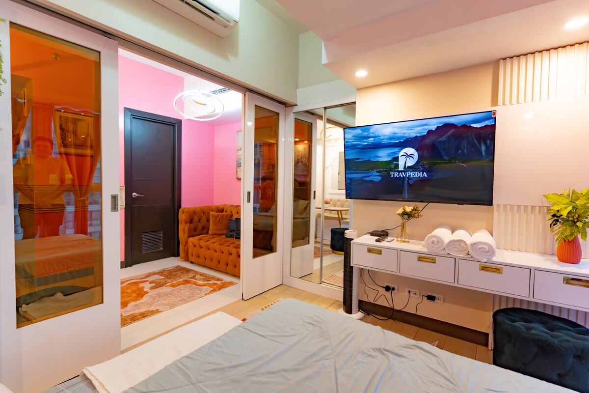 Απολαύστε το στιλ και την άνεση σε αυτό το μοντέρνο στούντιο στο BGC! Απέχει μόλις 2 λεπτά με τα πόδια από το εμπορικό κέντρο Venice Canal Mall και είναι ιδανικό για εργασία και αναψυχή. Απολαύστε ένα κρυμμένο πτυσσόμενο κρεβάτι queen size, ένα επεκτεινόμενο τραπέζι για φαγητό ή εργασία και έναν προβολέα 84" για μια κινηματογραφική εμπειρία. Λίγα βήματα από καφετέριες, παντοπωλεία και εστιατόρια, όλα όσα χρειάζεστε είναι κοντά σας. Αυτό το άνετο καταφύγιο είναι το ιδανικό μέρος για διακοπές, είτε θέλετε να χαλαρώσετε, να εξερευνήσετε την περιοχή ή να εργαστείτε εξ αποστάσεως! 🎬🎮✨