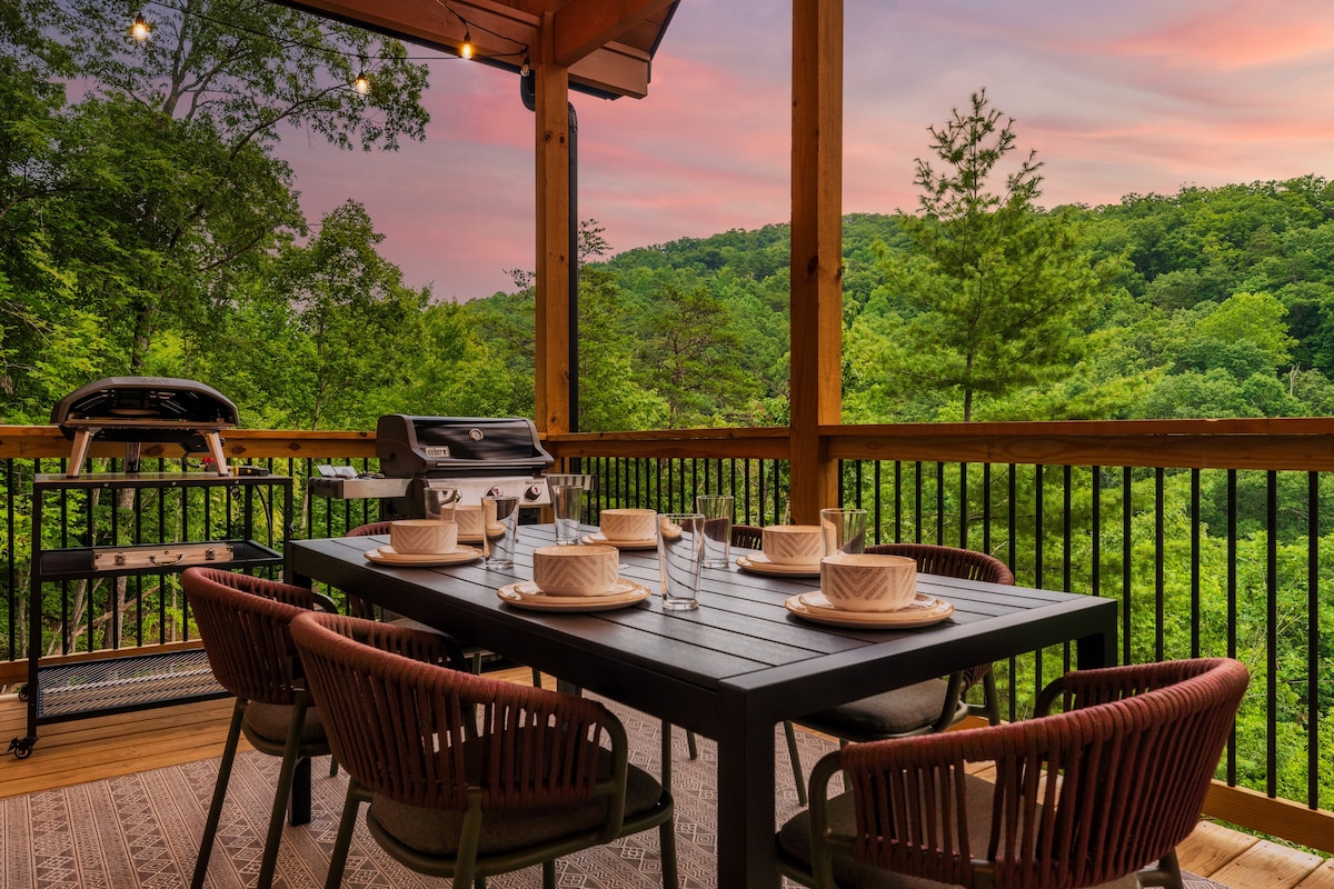 Η τέλεια απόδραση. Μαγευτική. Αυτή η εκπληκτική πολυτελής ιδιοκτησία προσφέρει εκπληκτική και απέραντη θέα στο Εθνικό Πάρκο Great Smoky Mountains από το σπίτι σας. Με μοντέρνο σχεδιασμό ξυλόσπιτου, αυτό το σπίτι και η ιδιοκτησία διαθέτουν τζακούζι, μπάρμπεκιου υγραερίου, αίθουσα παιχνιδιών, δύο σαλόνια και μια σπανιότητα στην Airbnb: ιδιωτικά μπάνια για κάθε υπνοδωμάτιο. Η ιδιωτική σας απόδραση στο βουνό! Προσβάσιμο και ήσυχο, μόνο 15 λεπτά από τα παντοπωλεία και τα εστιατόρια. Μείνετε εδώ και δημιουργήστε αναμνήσεις που θα διαρκέσουν μια ζωή!