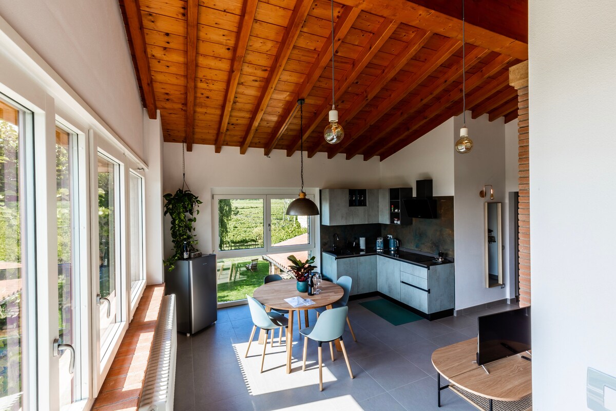 Contemporary Boutique B&B in VALPOLICELLA, in an ancient stone house with two elegant minilofts viewing the valley, a big GARDEN full of secluded spots surrounded by vineyards with an outdoor WHIRLPOOL to use private for 2 hours/day (only May-Sept because not heated). ΟΙΚΟΛΟΓΙΚΟ γεωθερμικό σύστημα για θέρμανση/ψύξη και ηλιακούς συλλέκτες για ζεστό νερό. Περιλαμβάνεται το φαγητό που απαιτείται για την προετοιμασία του πρωινού στη σουίτα. 20 λεπτά από τη Βερόνα, 30 λεπτά από τη λίμνη Garda, 25 λεπτά από το αεροδρόμιο.