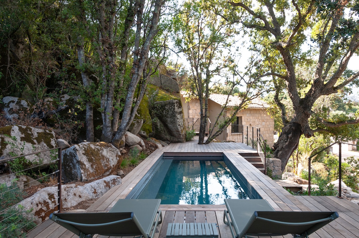 🌿 U Cantonu di l’Arti – Villa d’architecte avec piscine chauffée et vue montagne située à Sotta 🌄 Nichée dans un cadre naturel préservé, U Cantonu di l’Arti est une villa d’exception où l’architecture moderne se marie parfaitement avec la beauté sauvage du paysage corse. Conçue pour se fondre dans la végétation et les rochers environnants, cette villa vous invite à vivre un séjour raffiné, alliant confort, calme et vue imprenable. PISCINE FERMÉE DU 1ER DÉCEMBRE AU 1ER AVRIL