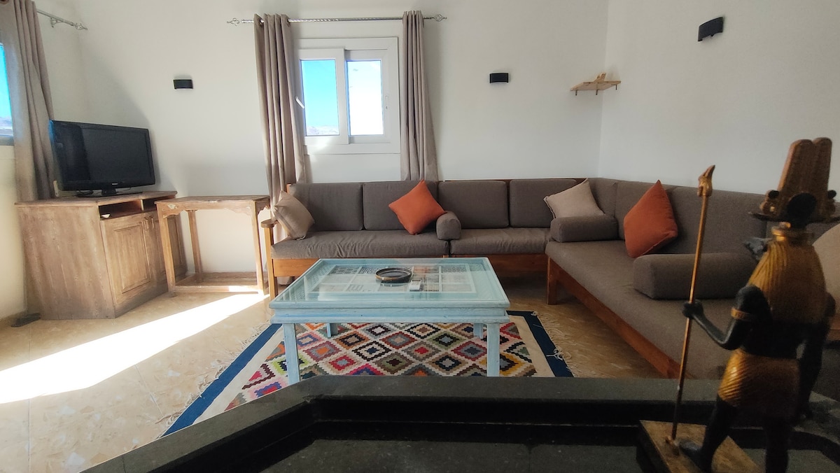 Το ιδιωτικό σας διαμέρισμα με ταράτσα 30 τ.μ. είναι η ιδανική ατμόσφαιρα - απολαύστε τον πρωινό σας καφέ, την προπόνησή σας, το ηλιοβασίλεμα ή την πάντα όμορφη στιγμή ηρεμίας απολαμβάνοντας τη θέα του Νταχάμπ. Στο εσωτερικό, θα βρείτε έντονα χρώματα, μια γωνιά για διάβασμα, έναν καναπέ για να απολαμβάνετε τον υπνάκο σας με τη θαλασσινή αύρα, χώρους για μαγειρική και ένα άνετο υπνοδωμάτιο εμπνευσμένο από τους Βεδουίνους. Παραλία και κορυφαίες καφετέριες; Μόλις 3 λεπτά μακριά. Υπάρχουν όλα τα απαραίτητα, ώστε να είναι έτοιμο για το Σαββατοκύριακο ή για έναν μήνα. Και φυσικά, η φιλοξενία του House of Riche σας στηρίζει σε κάθε βήμα.