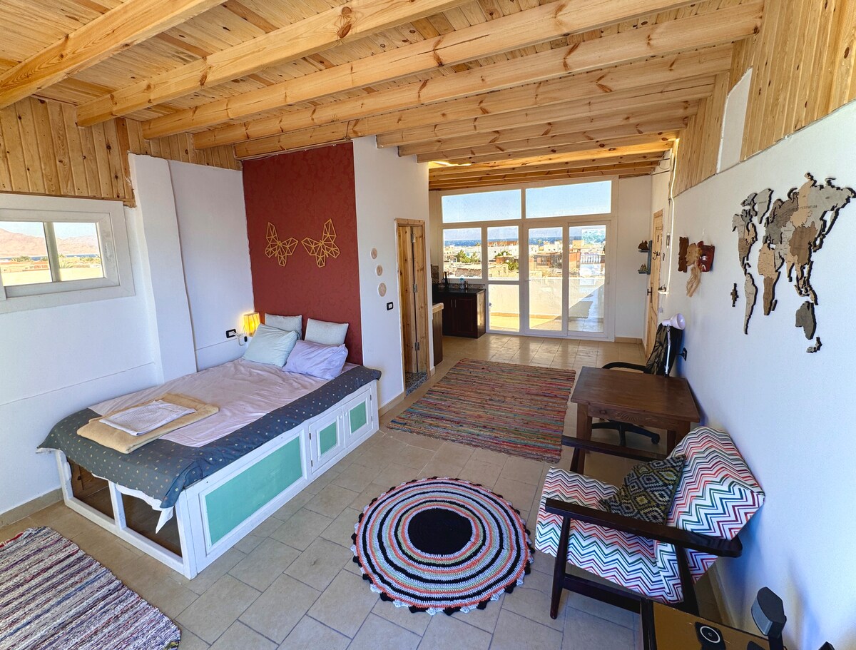 Located on our rooftop, we proudly present a stunning, super-bright and panoramic 40m² studio. Fully air-conditioned, it features a fully-equipped kitchen, a comfortable 160cm bed, a dining/work table with a computer chair, a flat-screen TV and a high-quality BOSE sound system. Enjoy breathtaking views from the private terrace overlooking the mountains and the seaside from the private balcony. Our building, DAHAB WORLD, is situated in the heart of Asala center, & just 5-minute walk from the sea.