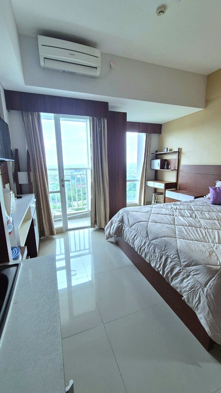 Your home away from home. Uniquely designed and cozy studio apartment for 2 guests + 1 little child. The room equipped with 1 queen size bed, modern bathroom, kitchen with basic cooking equipment, and balcony. Free parking, pool, gym, lobby area with cafe, restaurant, laundry, and mini market. Facilities: - 55 " smart TV - Wifi - AC - hot shower - refrigerator - microwave - electric stove - kettle - kitchen sink - basic cooking equipment - hair dryer - iron Note: - No breakfast
