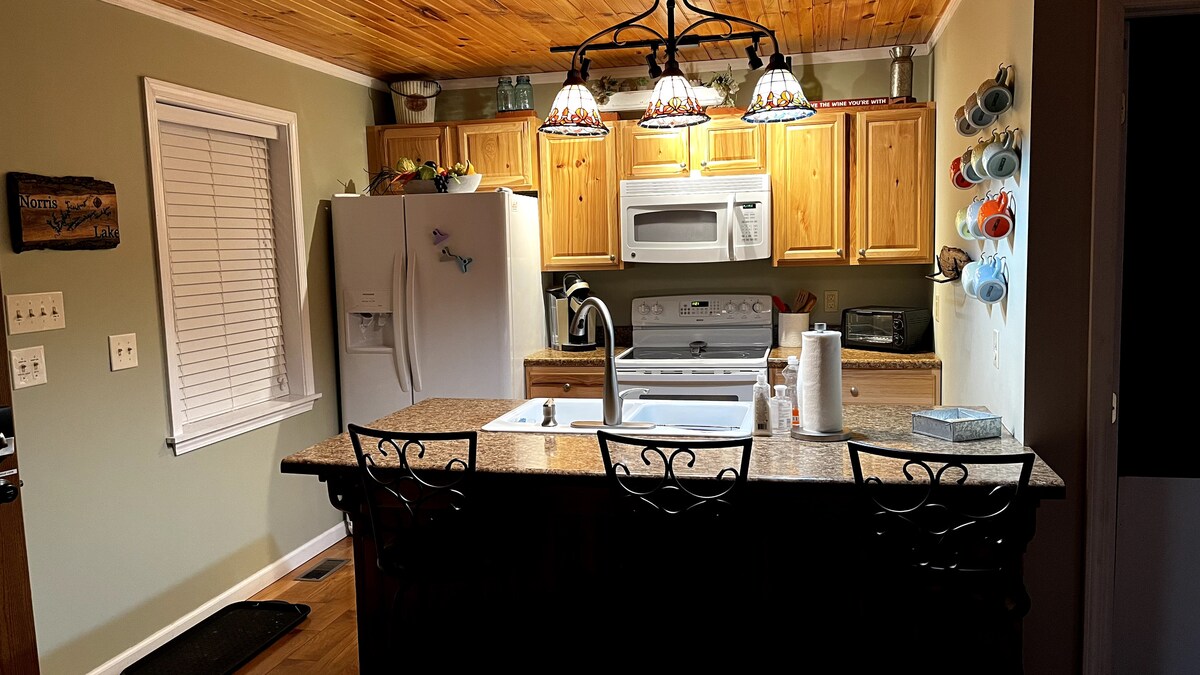 Χαλαρώστε με όλη την οικογένεια σε αυτό το ξυλόσπιτο μπροστά στη λίμνη Norris που διαθέτει ιδιωτική αποβάθρα, τρία υπνοδωμάτια, ένα φουτόν, δύο πλήρη μπάνια, μια πλήρως εξοπλισμένη κουζίνα, τραπεζαρία, δύο χώρους συγκέντρωσης, τρεις μεγάλες σκεπαστές βεράντες, ψησταριές Weber και Blackstone, ένα τζάκι εξωτερικού χώρου και έναν ιδιωτικό δρόμο για τα οχήματα ή το τρέιλερ σας. Ελάτε να επιπλέετε στον όρμο με ελάχιστη ή καθόλου κίνηση σκαφών. Το σπίτι φιλοξενεί 8 άτομα. 10 λεπτά από τα μονοπάτια για ATV στο Tackett Creek. Ελάτε να απολαύσετε όλα όσα έχει να προσφέρει η λίμνη Norris.