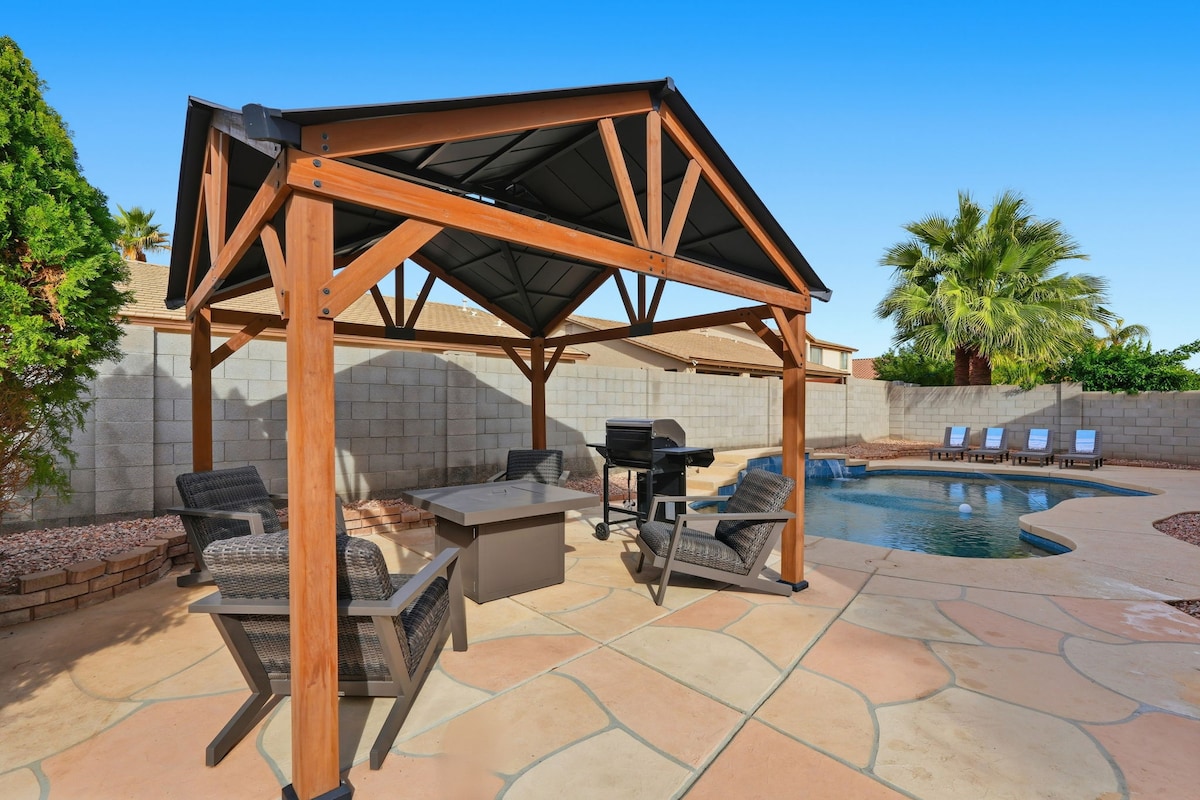 Family friendly Entertaining Home; Large covered patio with plenty of seating, fire table, Treager grill, Overlooking 10ft private heated pool Oct-May (included). Fully stocked chefs kitchen- double ovens, gas cooktop. Comfy beds, smart TVs in all bedrooms. Baby/kid friendly items. A perfect location for your Arizona getaway. Only 0.8 miles from the State Farm Stadium, Desert Diamond, Westgate with tons of local restaurants and adventures avoid traffic and walk to your event! Weekly discounts.