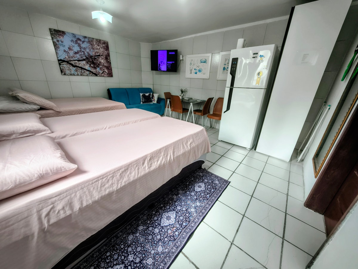 Espaço bem equipado com suíte. Possui ar condicionado, tv smart,frigobar,cama de casal e guarda roupas. Cozinha externa compartilhada, equipada com fogão, geladeira, mesa, cafeteira, sanduicheira, micro-ondas, dentre outros. Tem churrasqueira com área aberta para lazer. A cozinha é bem equipada com o necessário para preparar suas refeições. O ambiente é tranquilo, familiar e muito bem localizado. Próximo ao aeroporto dos Guararapes, centro da cidade, cidade universitária, Boa Viagem, Olinda...