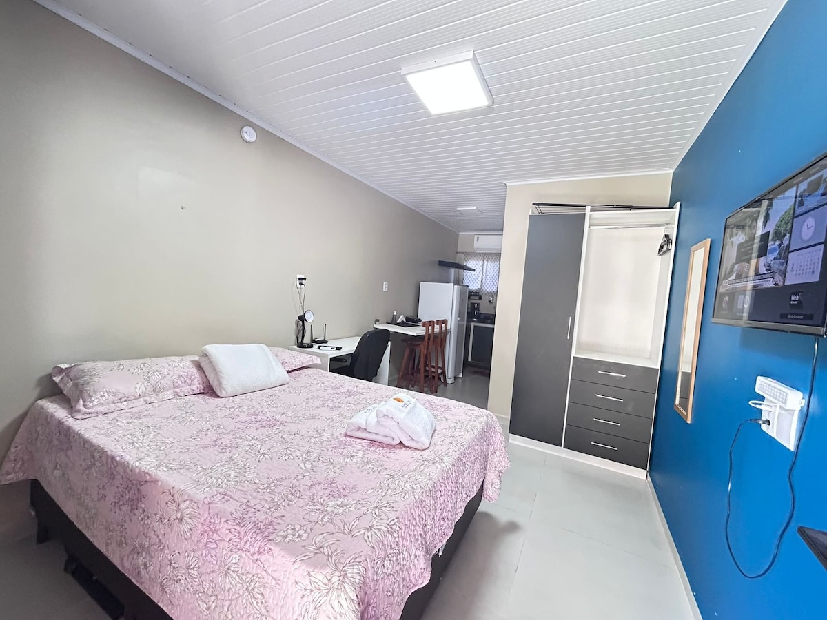Studio located in a quiet and private setting, with natural shade from a mango tree that makes the space cooler and more pleasant. It has a comfortable bed, air conditioning, private bathroom, and access to the pool and outdoor kitchen. Ideal for those seeking rest, convenience, and a hassle-free stay in Boa Vista.