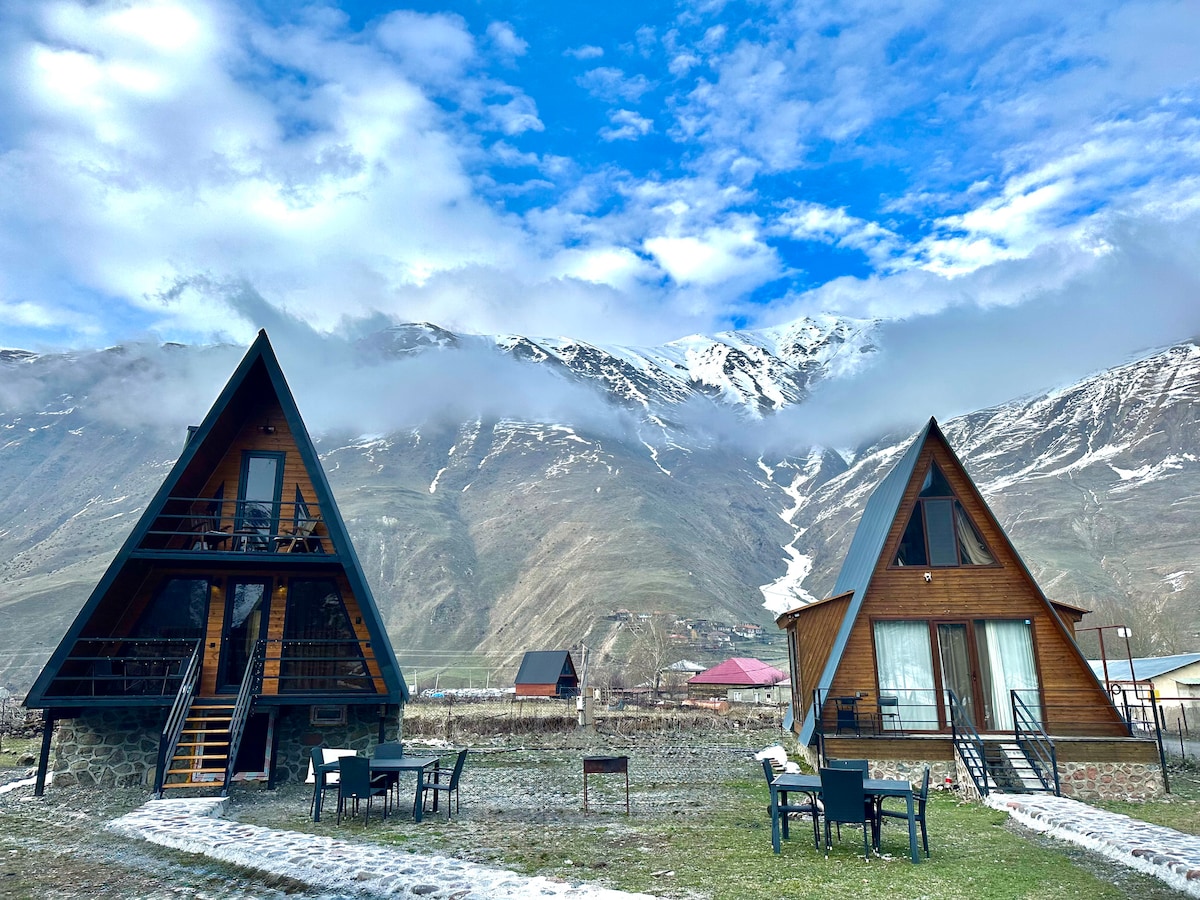 Peaceful A-frame cabin in Kazbegi - Stepantsminda by the river, surrounded by mountains. Enjoy fresh air, beautiful views, and total tranquility. Clean, cozy, and fully equipped. Perfect for couples, friends, or families. Close to hiking and waterfalls. Hosted by a Superhost for a smooth stay.