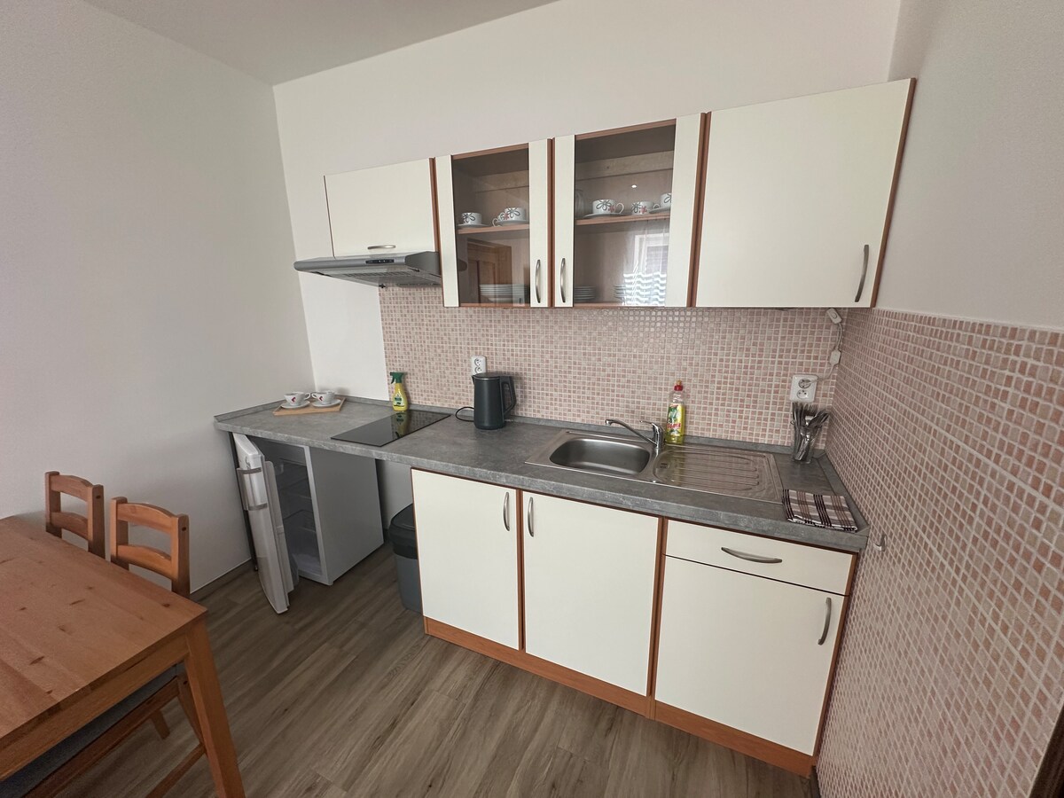 Κομψά καταλύματα στο Hustopeče u Brna στην ιδιωτικότητα και την ηρεμία ενός ιστορικού αστικού σπιτιού του 16ου αιώνα στο κέντρο της πόλης. Ιδανικό μέρος για ζευγάρια ή οικογένειες με παιδιά που θέλουν να ανακαλύψουν τις ομορφιές της Νότιας Μοραβίας με άνεση. Το διαμέρισμα προσφέρει άνεση για 2 έως 4 άτομα σε χώρο 55 τ.μ. Ευρύχωρο σαλόνι με τζάκι και γαλλικά παράθυρα, διπλό κρεβάτι και δυνατότητα για δύο επιπλέον κρεβάτια. Περιλαμβάνεται επίσης πλήρως εξοπλισμένη κουζίνα με πλυντήριο πιάτων και μεγάλη στρογγυλή τραπεζαρία ιδανική για κοινές στιγμές.