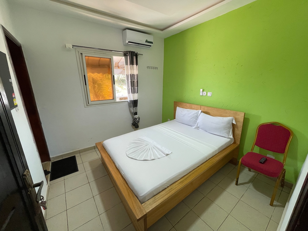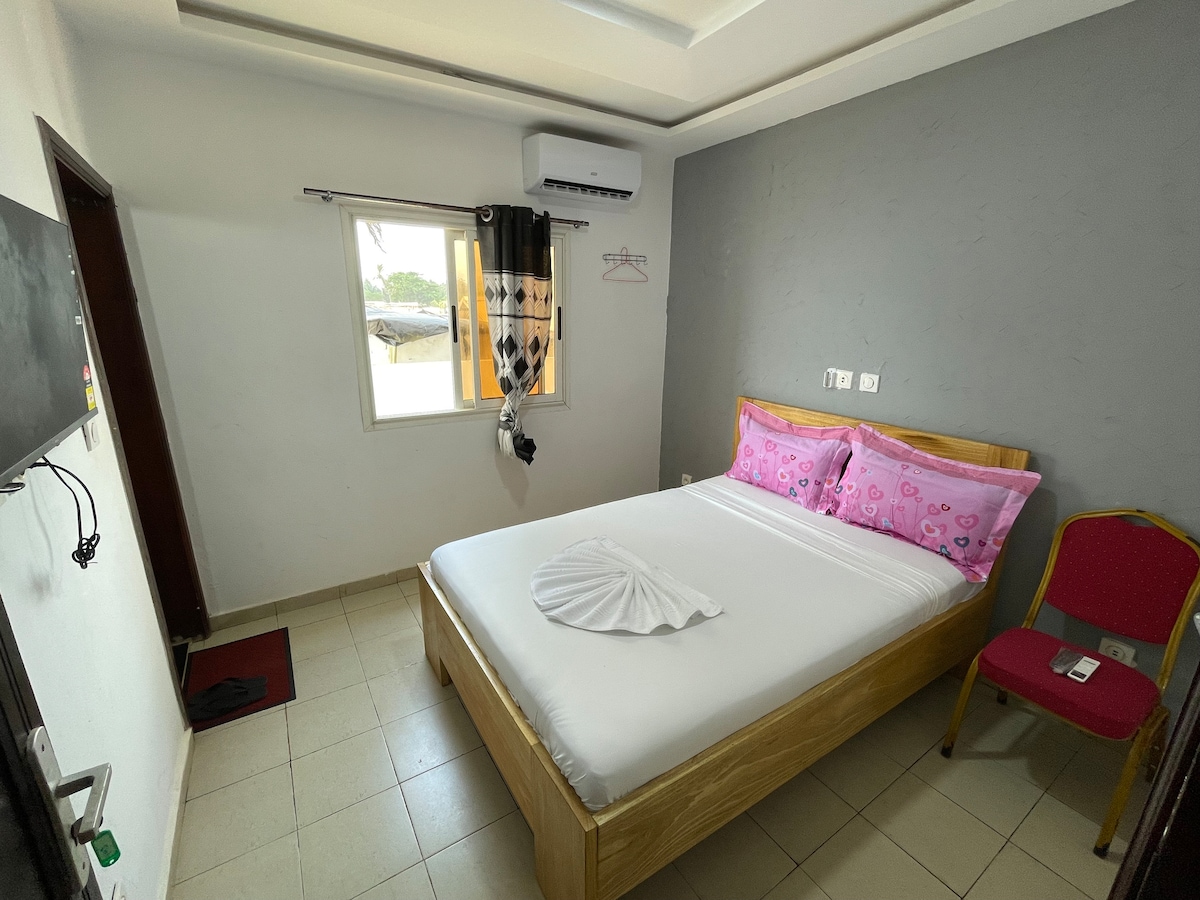 A Assouindé , station balnéaire, à l'est d'Abidjan, 1 chambre climatisée indépendante dans une maison d'hôtes avec salle de bain privée. Une grande terrasse à disposition dans un grand jardin à 2mn à pied de la plage et des restaurants.