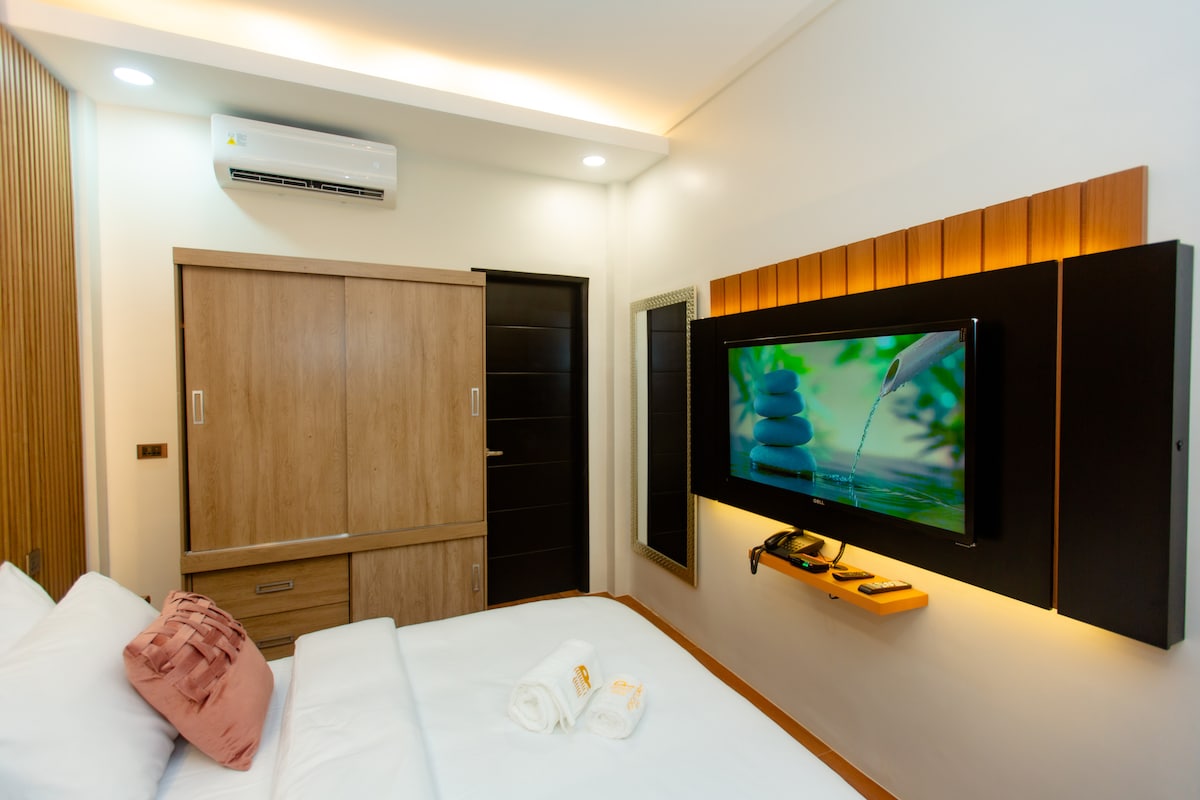 Stay, Relax & Explore in this brand-new, gated 2-bedroom home located in the heart of the city. The spacious Master Bedroom features a king bed, pull-out single bed, and couch, sleeping up to four guests. The Deluxe Room offers a queen bed for two. Enjoy strong Wi-Fi, heated shower, and secure gated parking. Cafés, bakery, and car wash are steps away, with KCC Mall just a mile away. Airport transfers available.