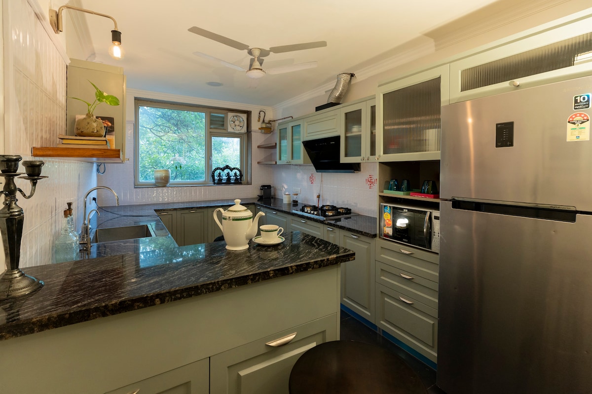 Μείνετε στο ευρύχωρο 2BR Park-View Retreat, 8,5 χλμ. από τα αεροδρόμια και 15 λεπτά με το αυτοκίνητο από το μετρό. Απολαύστε ευάερα μπαλκόνια, θέα στο πάρκο, κρεβάτια από μαόνι/ξύλο, πλήρως εξοπλισμένη κουζίνα, Wi-Fi υψηλής ταχύτητας, Smart TV, δωρεάν προϊόντα περιποίησης και τοπικές προτάσεις. Απολαύστε σπιτικά γεύματα, εξερευνήστε την κοντινή αγορά και τα εμπορικά κέντρα και χαλαρώστε με γαλήνια μονοπάτια για τζόκινγκ. Απολαύστε κορυφαία φιλοξενία με ευέλικτη άφιξη/αναχώρηση, υπηρεσίες πλυντηρίου και προαιρετικές μεταφορές από/προς το αεροδρόμιο. Κάντε κράτηση τώρα για μια αξέχαστη διαμονή στο Δελχί!