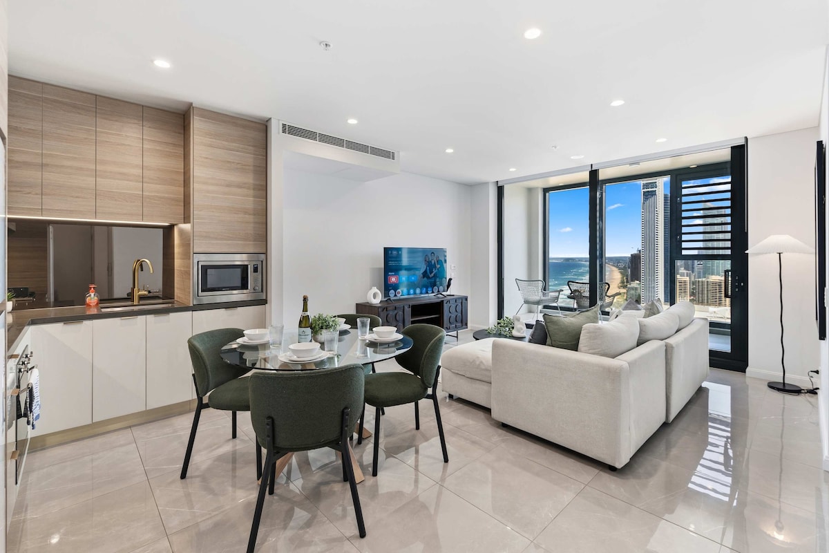 💝 Γιατί θα το λατρέψετε 📍 Εξαιρετική τοποθεσία στην Esplanade – Λίγα βήματα από την παραλία, τη Cavill Avenue, καταστήματα και νυχτερινή ζωή για σέρφερ 🌅 Ασυναγώνιστη θέα στον ωκεανό – Παρακολουθήστε την ανατολή του ηλίου πάνω από τη θάλασσα από το ιδιωτικό σας μπαλκόνι στον 67ο όροφο 🛏️ 2 υπνοδωμάτια με άνεση σε στυλ ξενοδοχείου – Περιλαμβάνει μια κύρια σουίτα με ντουλάπα και ιδιωτικό μπάνιο | Κλιματισμός σε όλο το κατάλυμα 🌿 Ιδιωτικό γυάλινο μπαλκόνι – Απολαύστε τον πρωινό σας καφέ με θέα στον ορίζοντα ή χαλαρώστε με το ηλιοβασίλεμα 🏊 Εγκαταστάσεις θέρετρου 5 αστέρων – γυμναστήριο, σάουνα και εξωτερική βεράντα (επίπεδο 33)